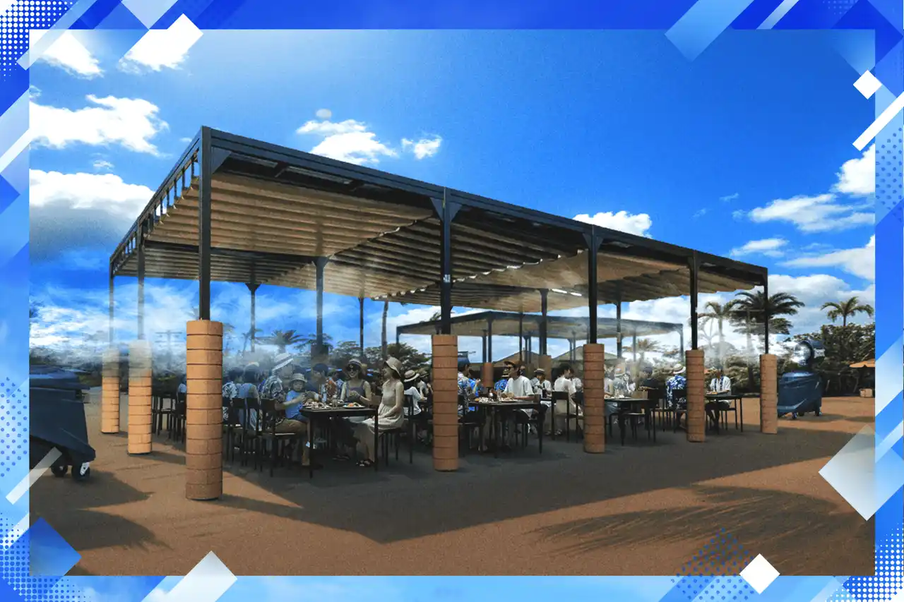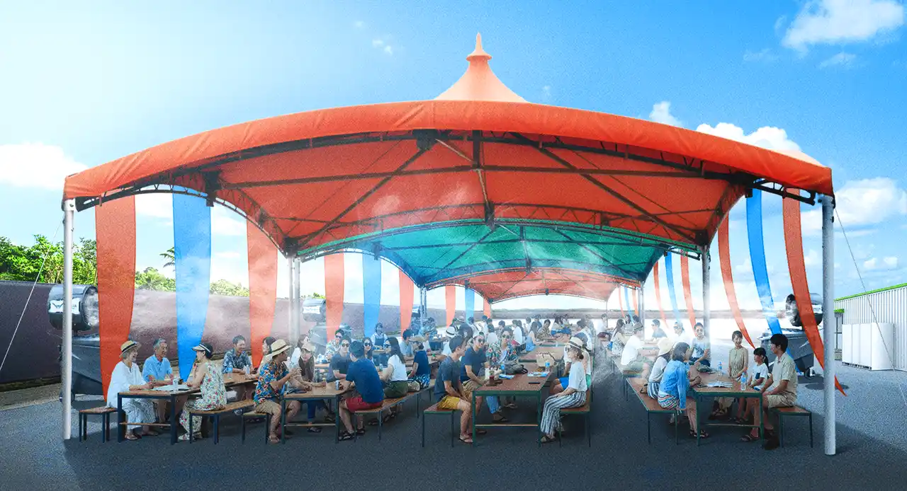 約260人が同時にランチが可能な新設休憩スペースが「ブリーズ アリーナ」に登場 この度、大型ショーの会場である「ブリーズ アリーナ」後方に、日除けのある大型休憩スペースを264席新設します。このスペースには大型ミストファンを設置し、涼める空間に。ゲストに自由にお立ち寄りいただきご利用いただけるほか、団体ゲストが一同に会して休憩場所や食事処として使うことができます。 ジャングリア沖縄には、以前から修学旅行や慰安旅行など、数多くの団体ゲストにお越しいただいています。団体旅行のお問い合わせをいただく中で、「集団で利用できる食事スペースがあれば、ジャングリアを旅行先として選択しやすい」というようなお声を多くいただいておりました。この度その声にお応えするスペースとして新設し、多くの団体ゲストをお迎えできる体制が整います。また、団体でのご利用時には、特別なランチボックスをご提供予定です。 |