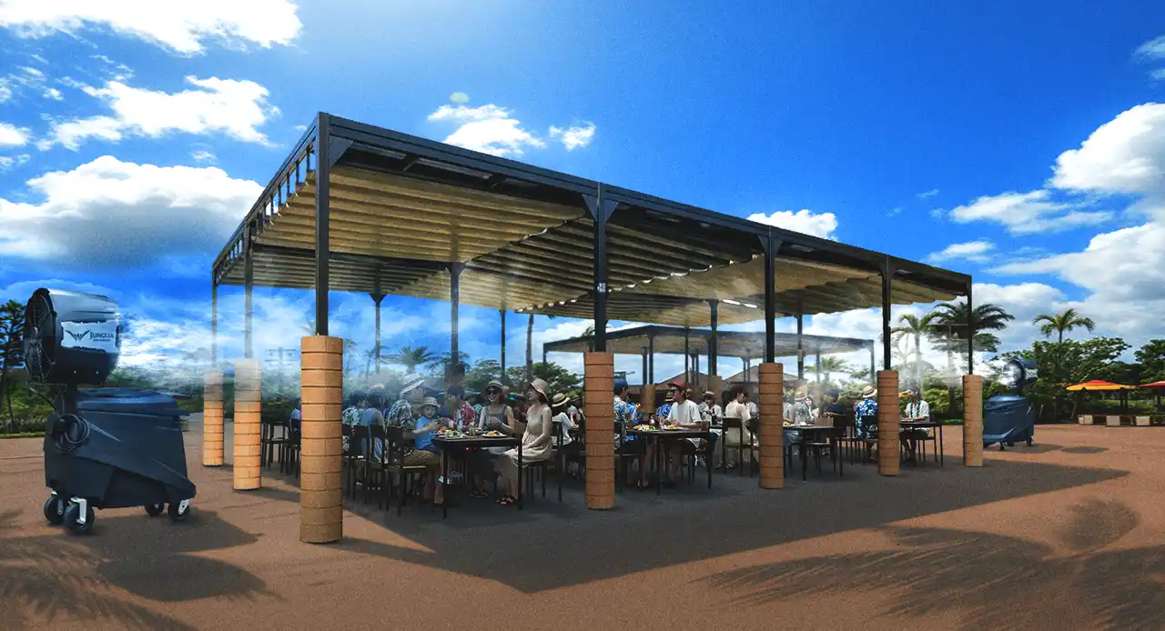 | ジャングリア沖縄では、大自然を満喫いただくために屋外スペースが多い設計となっており、ゲストから日陰や休憩スペースの充実を求めるお声をいただいておりました。ゲストの快適なパーク体験の向上と、加えてナビゲーター(従業員)の労働環境づくりのため、今夏に向けた暑さ対策を拡充しています。第一弾として花王「ビオレ」との協業による快適な体験づくりの取り組みを皮切りに、第二弾として、大型の屋根付き休憩スペースの新設や、広範囲に冷気を送る大型ミストファン(送冷風機)の大幅増設などの投資を積極的に行います。 | |||||||||