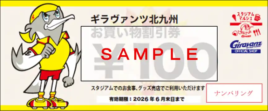 | ⑵ 条件をクリアした先着1,000名さまに 試合会場内で使える「お買い物割引券(100円分)」をプレゼント | |||||||||