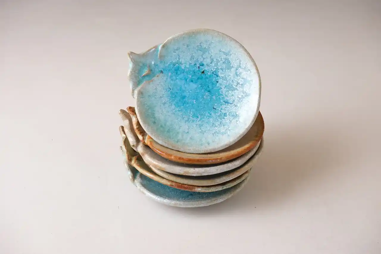 銀河釉-玉峰窯には「猫監督」として工房を案内し、焼き物作りを紹介する黒猫のネルソン君という猫がいます。猫作品がずらりと並ぶ工房には美しい釉薬と猫への愛があふれた作品が並び、猫好きなら一目ぼれすること間違いなし! |