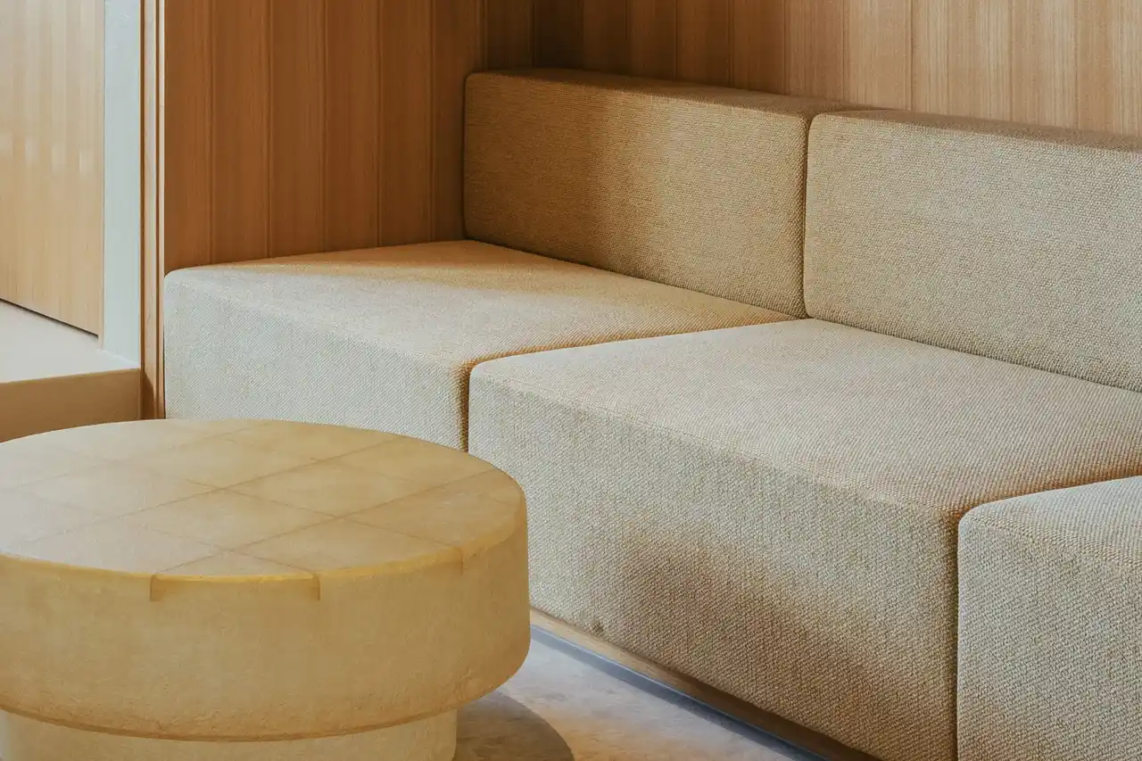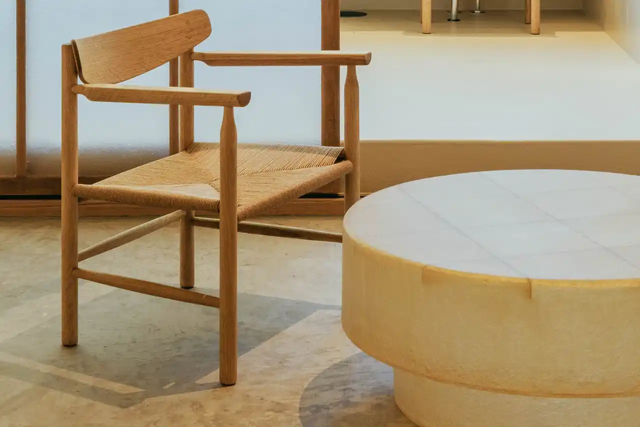 ザラザラとした質感のリシンに、船体に用いられるFRP。一般的に屋外で使われる建材で仕上げました。半透明のFRP建具やテーブルは、空間に揺らぎをあたえます。やわらかなベージュに包まれるひとときをお過ごしください。 |