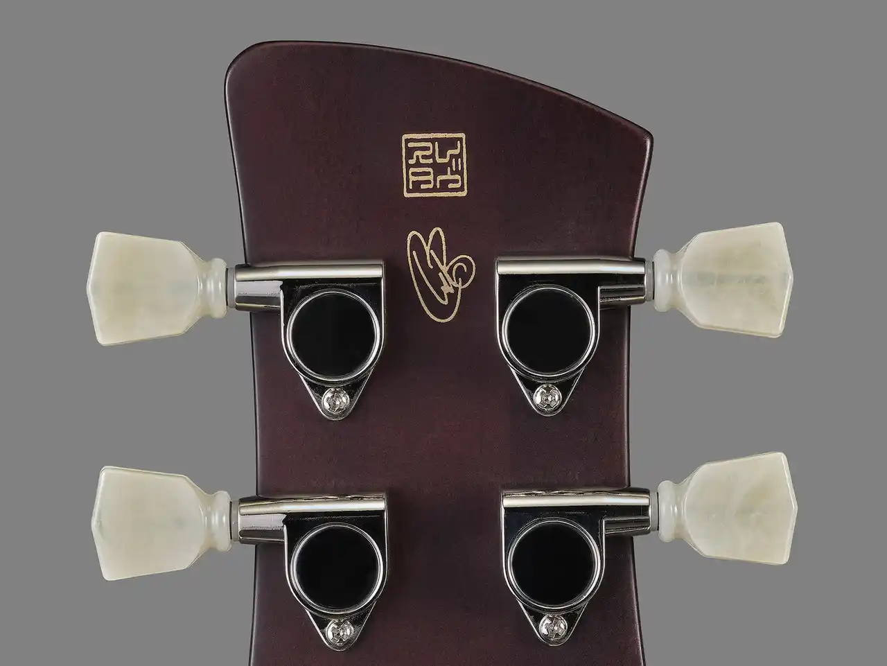 ボディカラー(ハニーゴールド)、ボリューム・トーンノブ(アンバー・ハットノブ)、指板のポジションマークなど、クリス・バック氏本人のカスタムモデルを忠実に再現。ヘッドストック裏のサインは、世界中をともに旅したこのギターへのクリス氏の愛着を象徴しています。 |