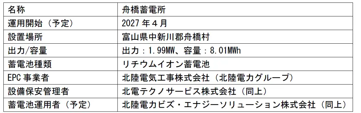 北陸電力株式会社(以下「北陸電力」)およびみずほリース株式会社(以下「みずほリース」)の100%子会社であるエムエル・パワー株式会社(以下「エムエル・パワー」)は、「舟橋蓄電所合同会社」を設立し、富山県中新川郡舟橋村における2027年4月の蓄電所運開を目指し、系統用蓄電池事業に参入しますので、お知らせいたします。