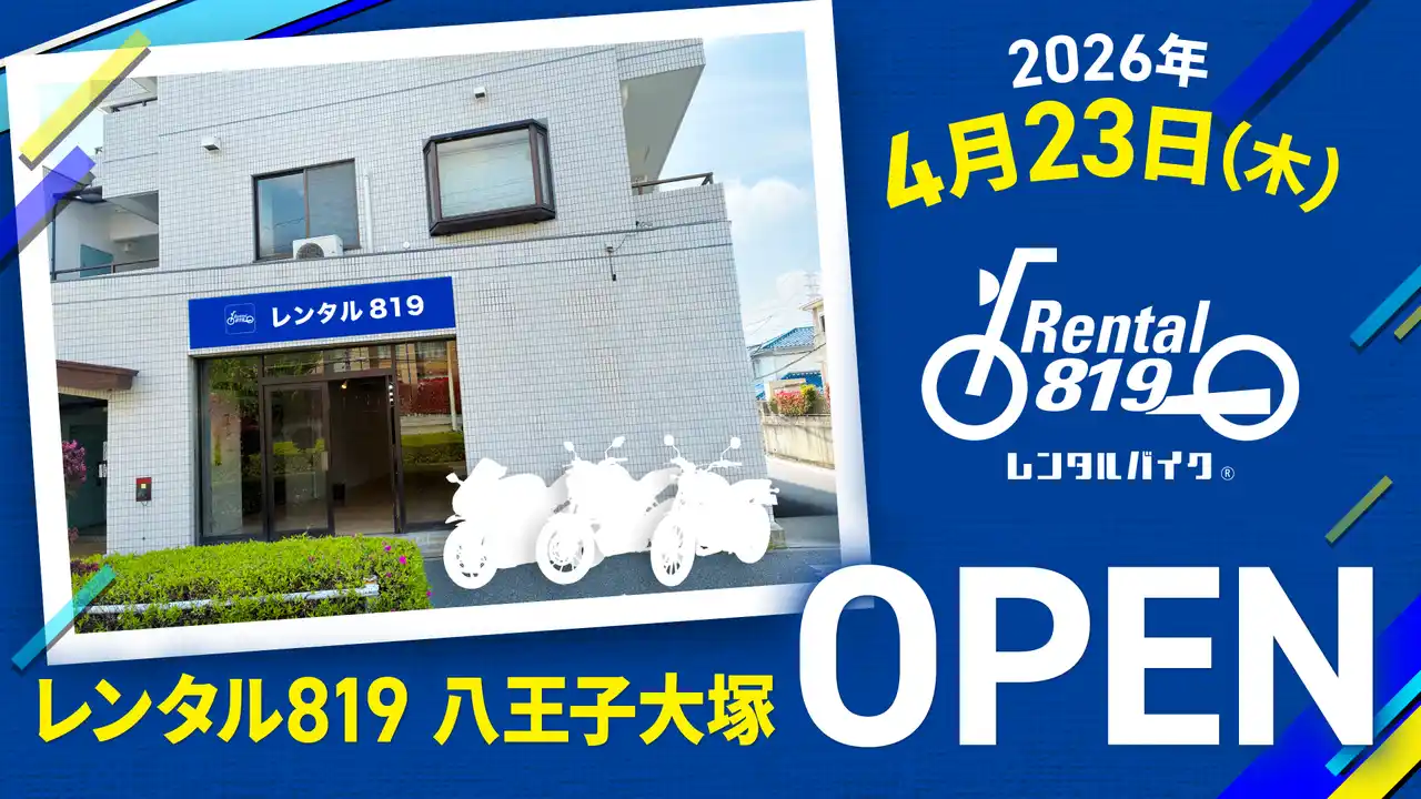 | オートバイの全国レンタルサービス「レンタル819」を展開する株式会社キズキレンタルサービス(本社:埼玉県川口市)は、2026年4月23日(木)、東京都八王子市に「レンタル819八王子大塚」をオープンいたします。 | |||