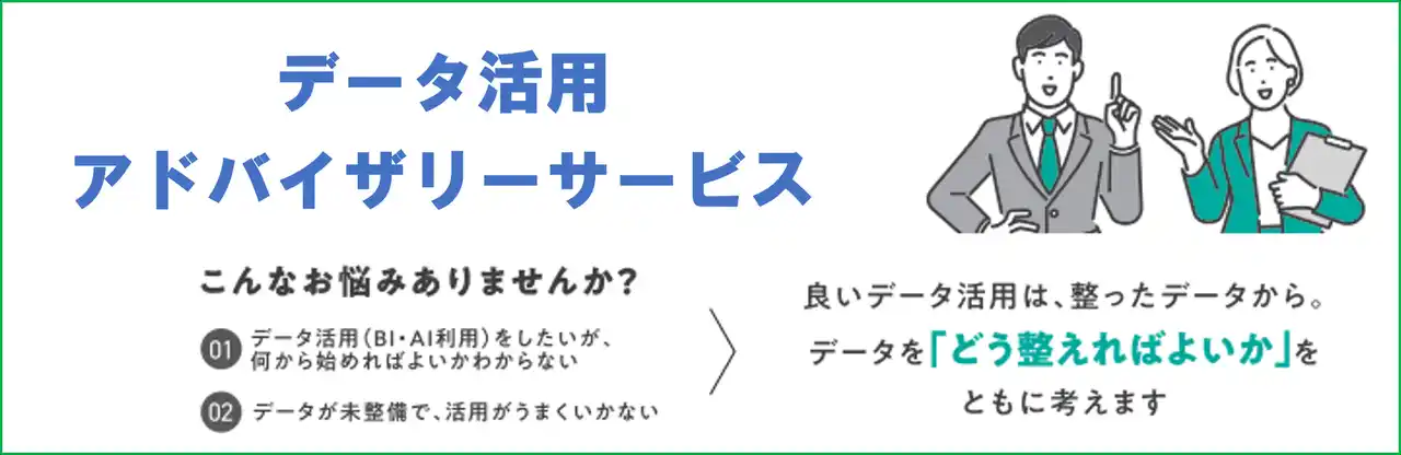 「データ活用アドバイザリーサービス」は、AIやBIの活用を見据え、企業が保有するデータを「活用できる状態」に整えるためのアドバイザリーサービスです。データ、システム基盤、データの見せ方・使い方、運用体制といった複数の観点から現状を整理し、今後のAIやBIの活用につながる実行可能な方針を導き出します。当社は、BIビジネスを中核事業の一つとして、長年にわたりデータ分析基盤の構築・活用支援に取り組んできました。その中で蓄積してきた、「どのようなデータ整備がAIや高度分析に効くのか」、「どこでつまずくと活用が止まるのか」といった実践的な知見を、本サービスに集約しています。 |