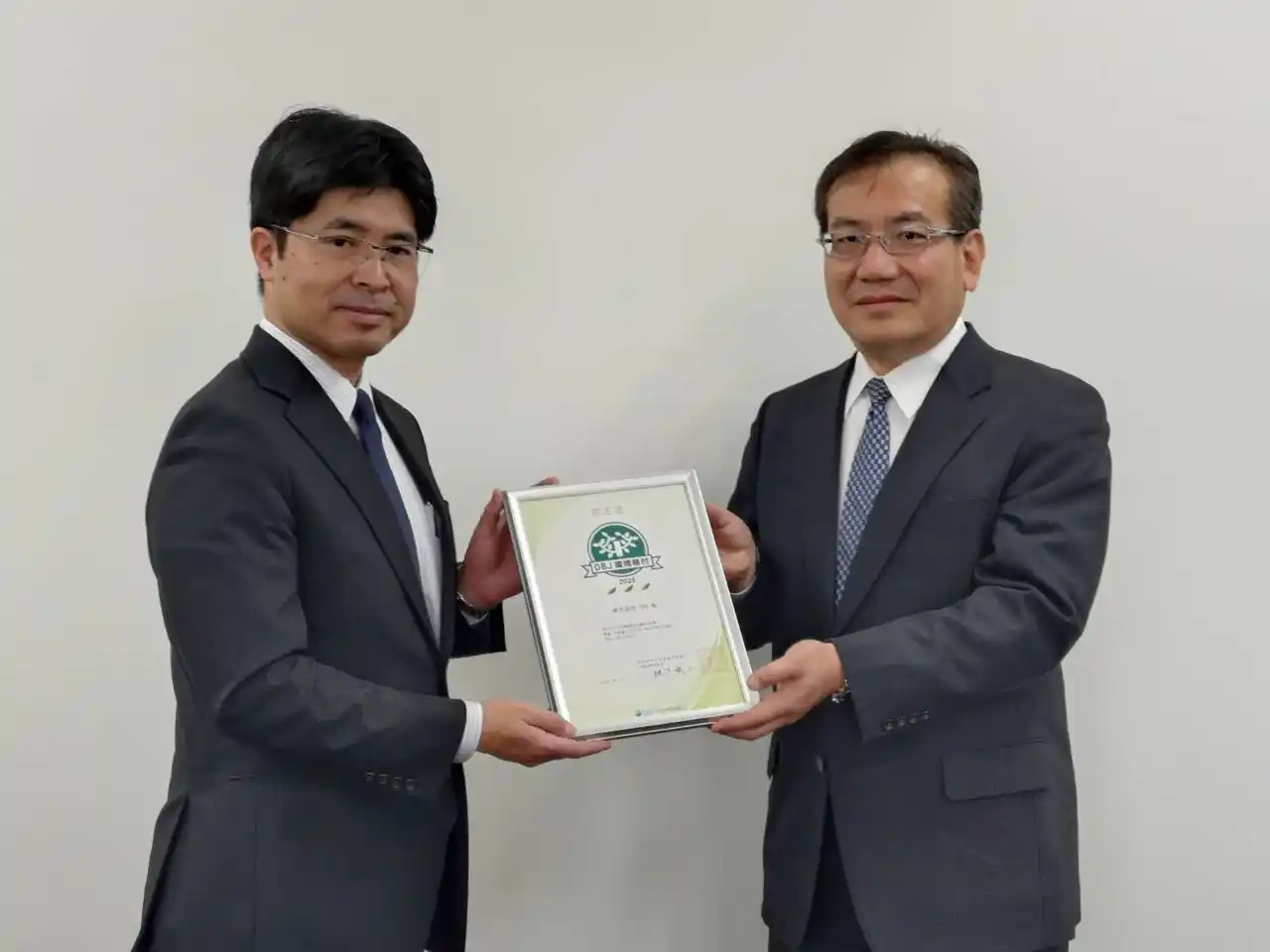 2026年4月22日に当社で行われた表彰式の様子 (左)DBJ 東北支店長 岡井 覚一郎 様、(右)当社 代表取締役社長 尾方 馨 |