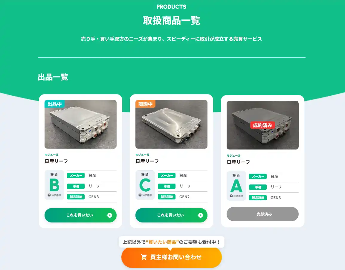 循環型マーケットデザインの株式会社オークネット(本社:東京都港区、代表取締役社長CEO:藤崎 慎一郎、以下:オークネット)は、使用済みEV(電気自動車)リチウムイオンバッテリー(以下:EVバッテリー)を活用したリパーパス製品などの流通プラットフォーム「Energy Loop Terminal(エナジー・ループ・ターミナル)」のバッテリー売買サービスをリニューアルいたしました。また、「Energy Loop Terminal」の売買サービスリニューアルに伴い、MIRAI-LABO株式会社(本社:東京都八王子市、代表取締役社長:平塚 利男、以下:MIRAI-LABO)と共同開発したバッテリー診断について、単体で利用可能な診断サービスの提供も開始いたします。 |