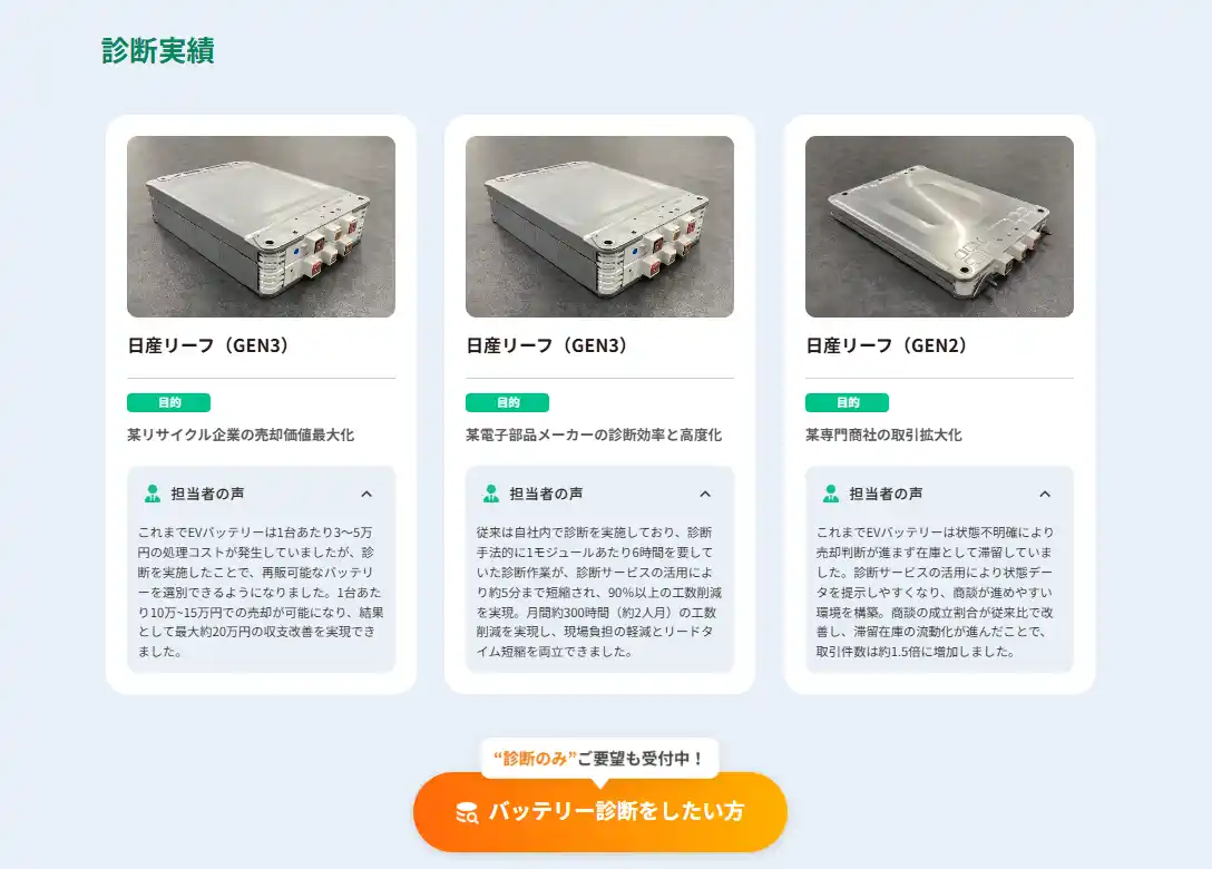 リパーパス製品メーカー担当者は、次のように述べています。「診断時間の短縮に加え、実測値比で±5%以内という精度の高さに驚いています。これまで自社で充放電による診断を行っていましたが、SOH精度が担保された状態で仕入れられる点は、今後の調達において大きな価値があると感じています。」 |
