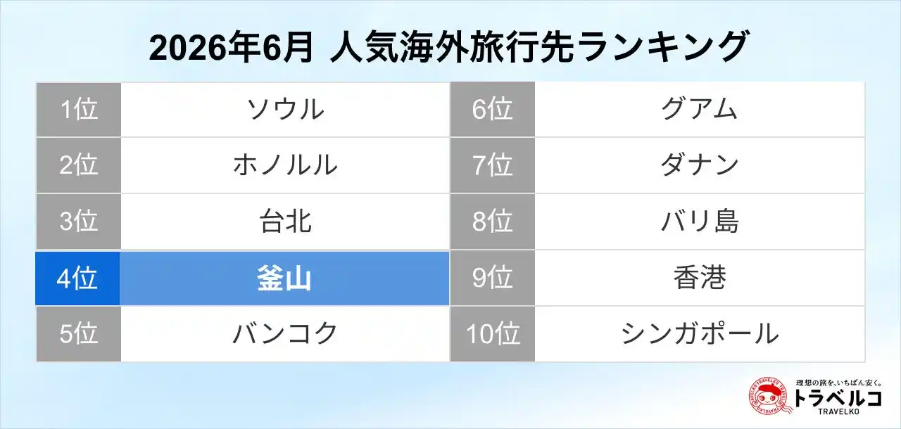 「2026年6月の人気海外旅行先ランキング」*では、海外旅行コストの上昇を背景に、航空券代を比較的安く抑えられる近距離アジア圏の検索数が増加しました。特に釜山は、検索数が前年同月比で約1.7倍に増加し、前年の7位から4位へと順位を上げています。 |