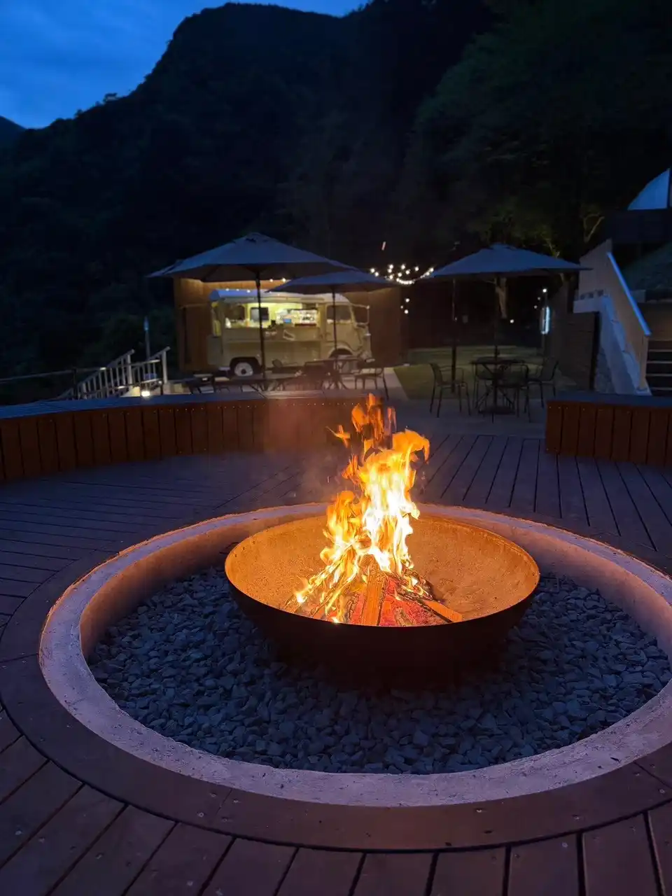 施設内には夕暮れになるとアウトドアBARがオープン。大きな焚き火(BIG FIRE)と共に夕食後の秘境の夜が楽しめたり、サウナエリアではアウトドアサウナ、アクティブなお客様には大自然を満喫可能な渓流サウナやリバーリング体験もご用意しています。 |