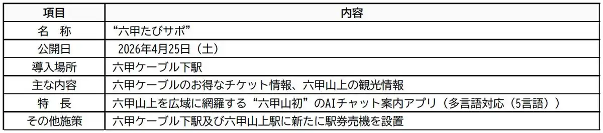 六甲ケーブルのお得なチケットの情報やアクセス情報、六甲山の観光施設の情報を案内する、多言語対応(5言語)のAIチャットアプリ「六甲たびサポ」を開発し、2026年4月25日(土)から六甲ケーブル下駅で公開します。