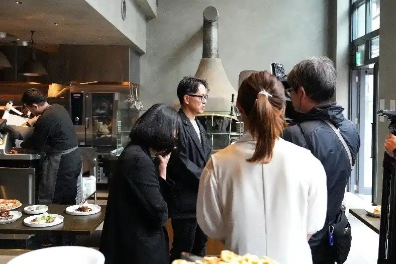 開業に先駆け、2026年4月17日に開催された「メディア向け内覧会」には、多くのメディアの方にお越しいただき、「THE KNOT」ブランドのコンセプトや、レストランとの協業、福岡に出店した目的、「THE KNOT FUKUOKA Tenjin」にかける期待等を、株式会社MOTHERSの保村代表取締役とオーナーであるいちご地所代表取締役社長の細野との代表対談で説明させていただきました。 |
