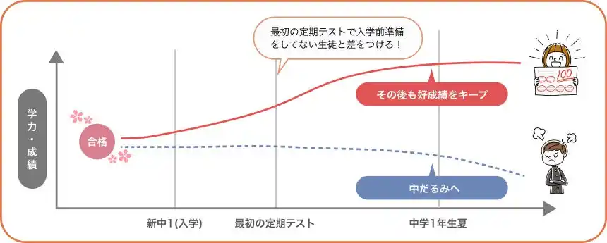 もうすぐ迎える最初の定期テストの結果は、お子さま自身の「自己評価の基準点」として刻まれ、その後の学習モチベーションにも影響を与えます。本セミナーは、こうした"静かに進行する中だるみ"を入学後1ヶ月のタイミングで防ぐことを目的としています。 |