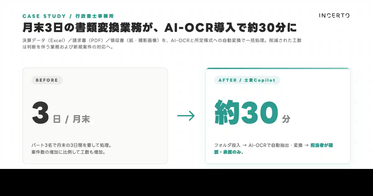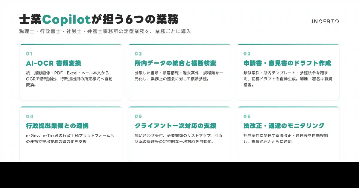 Incerto合同会社(本社:東京都荒川区、代表:佐藤碧人、https://www.incerto.tech/)は、税理士・行政書士・社労士・弁護士などの士業事務所向けAIシステム『士業Copilot』の提供を開始いたしました。製品詳細は製品ページ(https://www.incerto.tech/products/shigyo-copilot)にて公開しております。 |