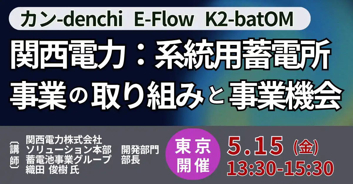 JPI(日本計画研究所)は、関西電力株式会社 ソリューション本部 開発部門 蓄電池事業グループ 部長 織田 俊樹 氏を招聘し、系統用蓄電所事業の取り組みと事業機会について詳説いただくセミナーを開催します。 |