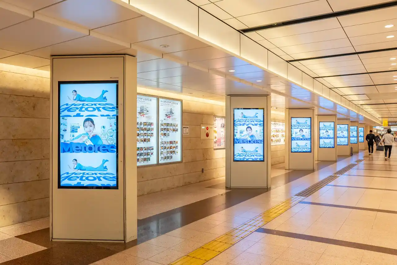 現在放映中の地上波テレビCMやTVer、YouTube等のデジタル広告に加え、通勤中のビジネスパーソンとのオフラインでの接点も創出するため、東海エリア最大のターミナル駅であるJR名古屋駅にてデジタルサイネージ広告を開始しました。日本のものづくり産業が集積する東海エリアの交通の中心、JR名古屋駅への掲出により、デジタル広告だけではリーチしきれない層へも「メトリー」との接点を創出し、さらなる認知拡大を図ります。 |