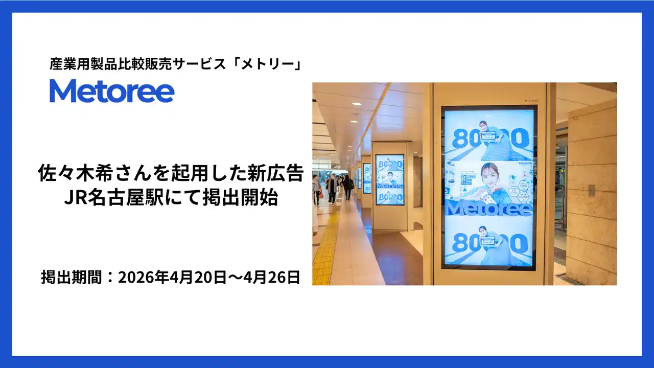 ZAZA株式会社(代表取締役:永津 豪、所在地:愛知県名古屋市)が運営する、産業用製品比較販売サービス「メトリー」(https://metoree.com/)は、佐々木希さん出演の新CM「産業用製品ほしいの見つかる!編」を、2026年4月20日より、JR名古屋駅桜通口側地下通路の14面連続多面型デジタルサイネージにて、掲出を開始しました。