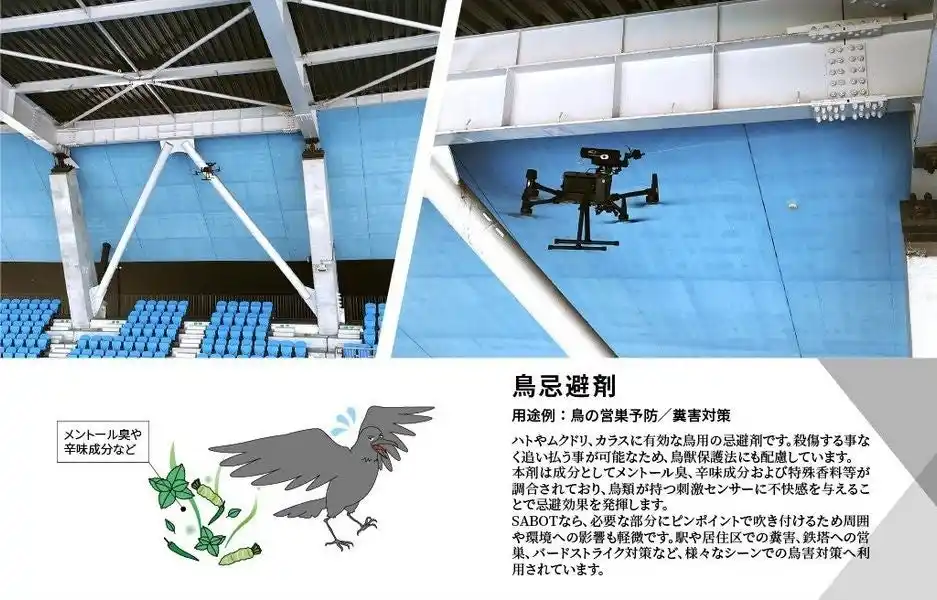 ドローン用スプレー缶噴射装置 『SABOT-3』を活用し、高所や立入困難箇所における、営巣や糞害の予防(ハト、カラス、ムクドリに有効)といった鳥被害に対応する鳥忌避剤の散布を行うことが可能です。さらに、搭載するスプレー缶を交換することで、錆部・外壁劣化箇所の簡易補修など様々な用途にも対応します。自治体様の悩みに沿ったご提案をいたします。 |
