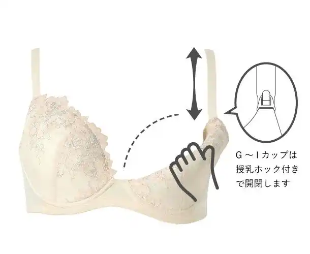 | D~Fカップは、伸縮性のあるストラップ設計によりカップ部分を片手でめくれる仕様。G~Iカップは、上から下へ大きく開くホックつきで、授乳しやすい構造です。妊娠中から授乳中まで快適に着用できます。 | ||||||||||||||