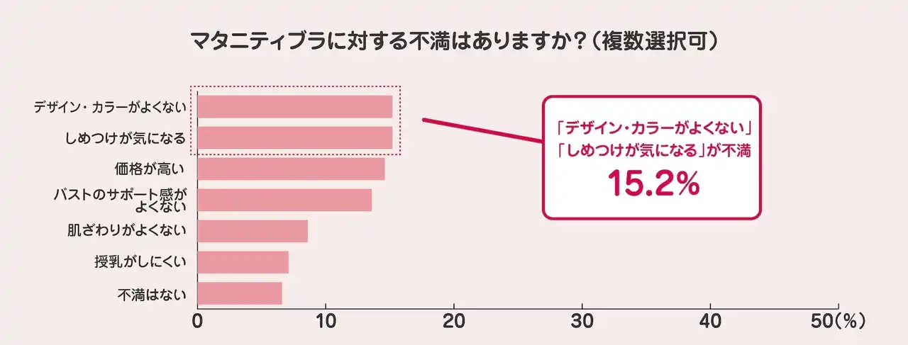 | また、「マタニティブラに対する不満はありますか?(複数回答可)」と尋ねたところ、「デザイン・カラーがよくない(15.2%)」と「しめつけが気になる(15.2%)」が同率でトップに。さらに、「価格が高い(14.6%)」も続き、デザイン面に加え、着用感や価格に対する不満も一定数あることが明らかになりました。 | ||||||||||||||
