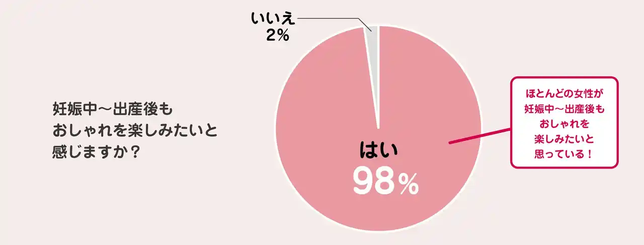 | 「妊娠中~出産後もおしゃれを楽しみたいと感じますか?」という問いに対し、98%が「はい」と回答。からだの変化が大きい時期であっても、自分らしいスタイルや好みのデザインを身につけたいと考える人が多いことが明らかになりました。 | ||||||||||||||