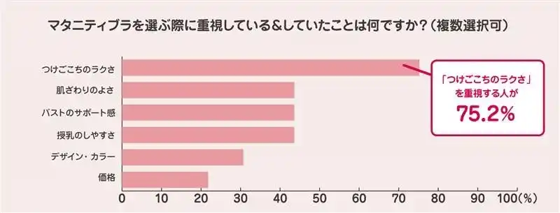 | 「マタニティブラを選ぶ際に重視している&していたことは何ですか?(複数選択可)」の質問では、「つけごこちのラクさ(75.2%)」が最多に。次いで、「肌ざわりのよさ(43.6%)」「バストのサポート感(43.6%)」「授乳のしやすさ(43.6%)」が同率で続きました。 | ||||||||||||||