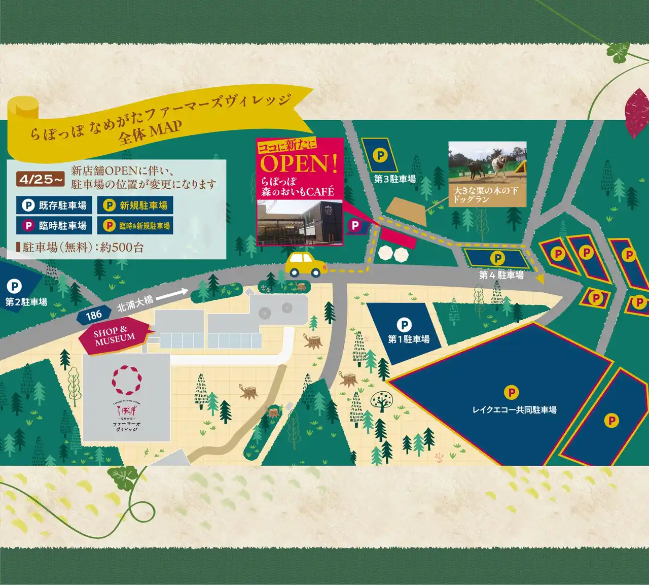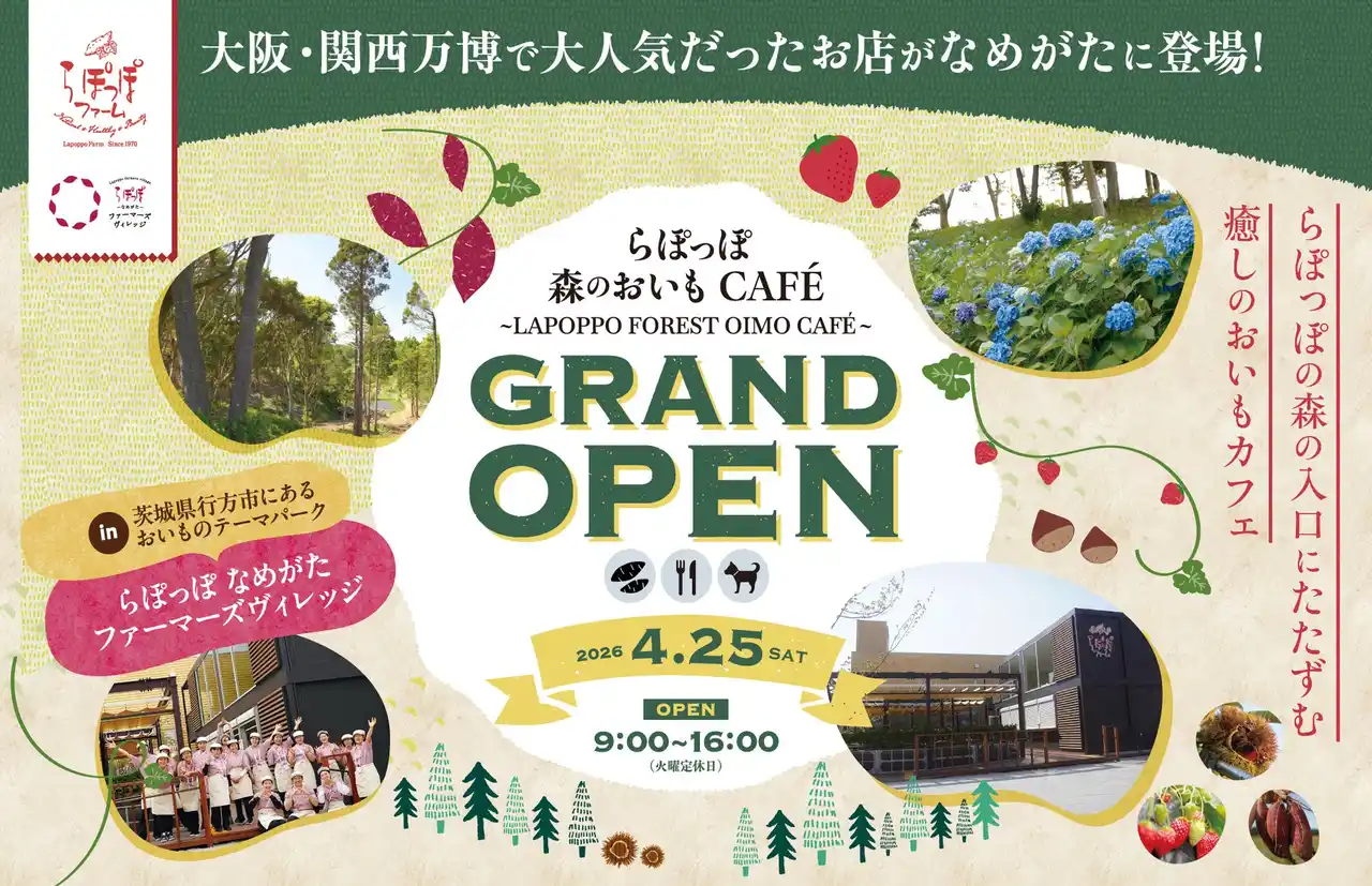 白ハト食品工業株式会社(本社:大阪府守口市/代表取締役社長:永尾俊一)が運営する、やきいもの聖地「らぽっぽ なめがたファーマーズヴィレッジ」(茨城県行方市)では、2026年4月25日(土)、「らぽっぽ 森のおいもCAFE」をオープンいたします。本店舗は、昨年開催された2025大阪・関西万博で大人気を博した、らぽっぽファーム「おいもとイチゴとりんごのFarm to the Table」を、“万博のレガシー”として移設・リニューアルしたものです。大阪・関西万博での想いをつなぎながら、これからも多くのお客様との新たな出会いをお届けしてまいります。 |