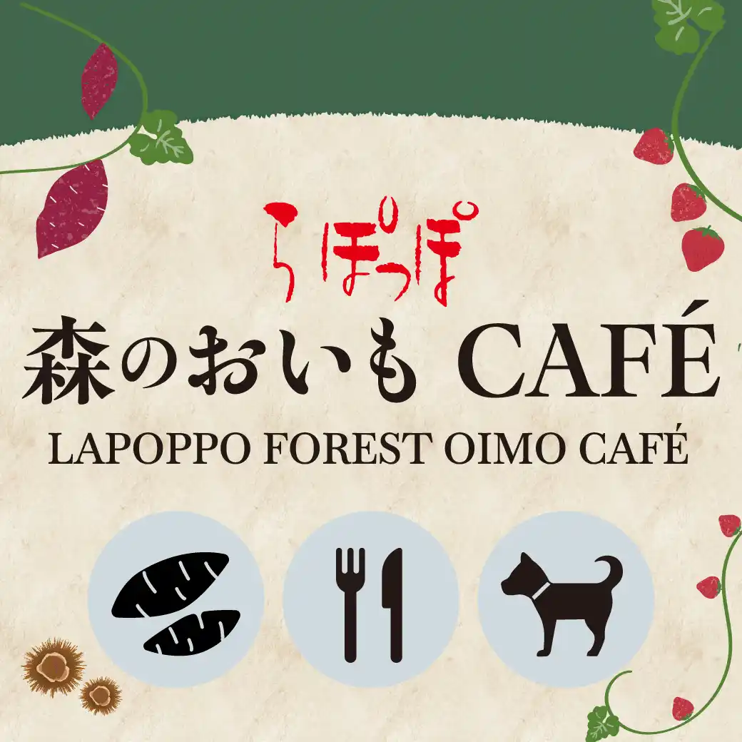 らぽっぽ 森のおいもCAFEでは、大きな栗の木の下にあるドッグランや、わんちゃんと過ごせるテラス席もご用意しております。わんちゃんと一緒に楽しめるおいもや新鮮野菜のメニューも充実し、ゆったりとした時間をお過ごしいただけます。 |
