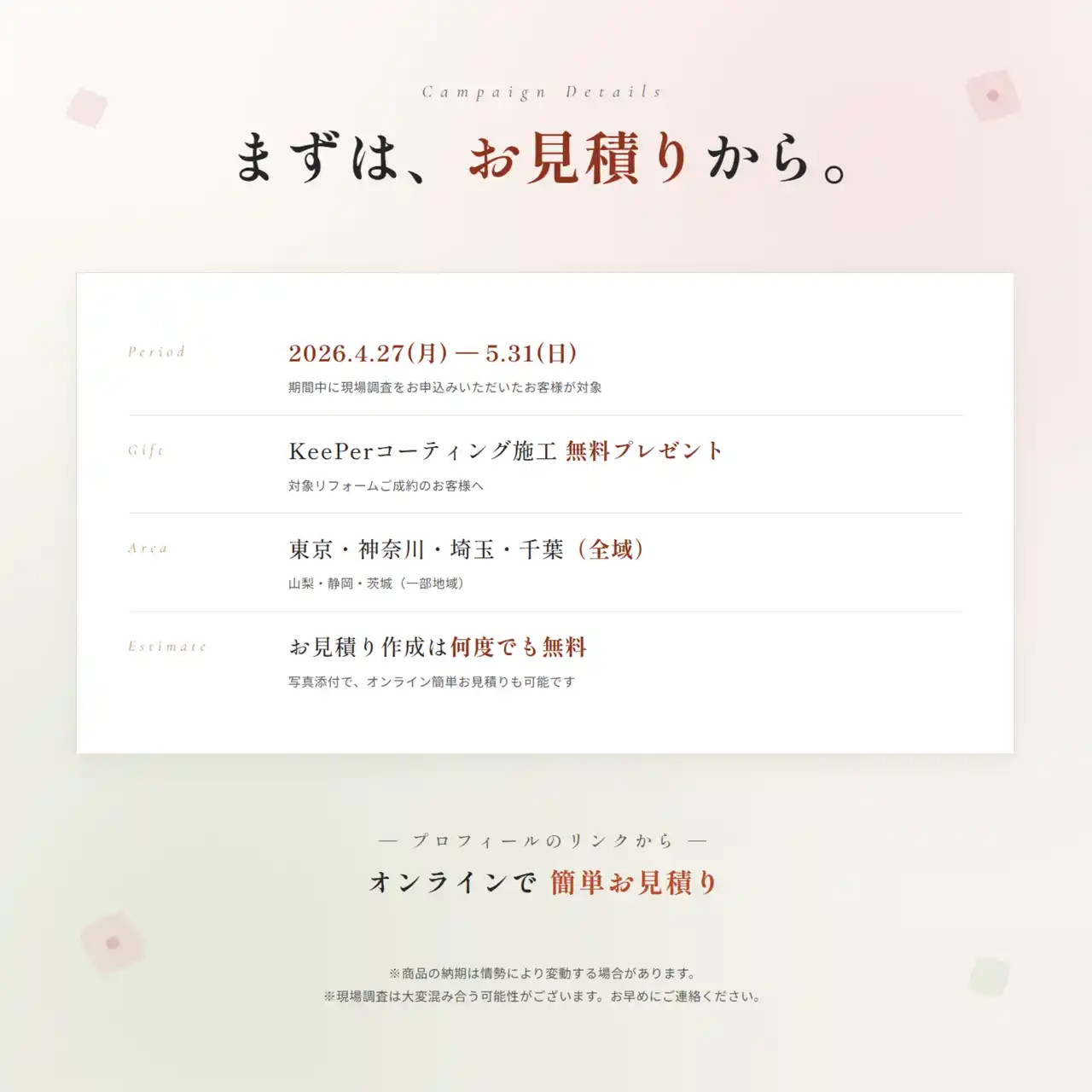 2026年4月27日(月)~5月31日(日)※現場調査お申込み分 |
