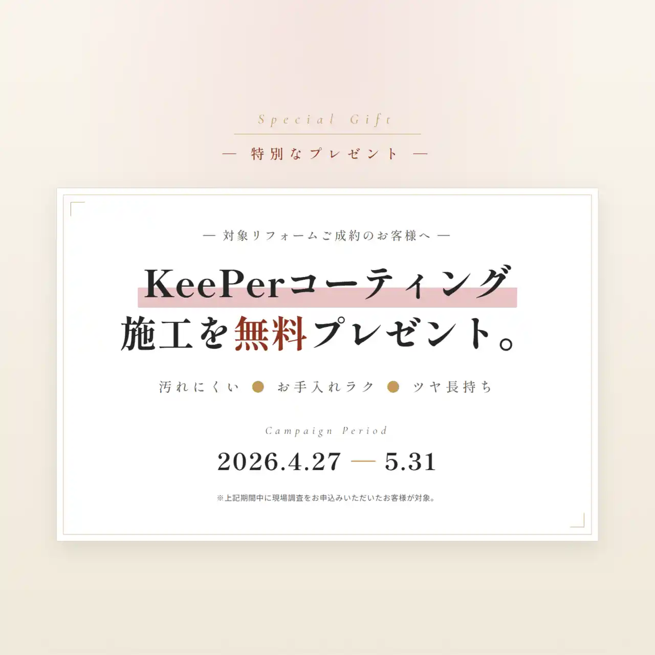 対象リフォームご成約で、プロ仕様のKeePerコーティング施工を無料プレゼント(汚れにくい・お手入れラク・ツヤ長持ち) |