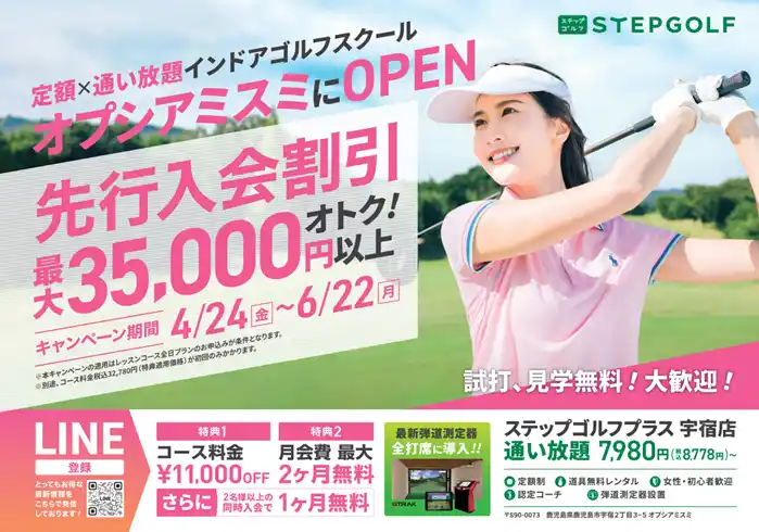 世界最大級のインドアゴルフスクールを運営するステップゴルフ株式会社(本社:東京都渋谷区、代表取締役:榎本考修 以下、ステップゴルフ)は、今年6月に、鹿児島県内では初出店となる『ステップゴルフプラス宇宿店』をグランドオープン予定です。 |