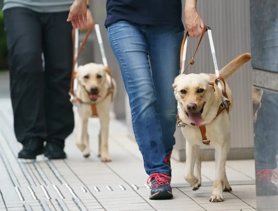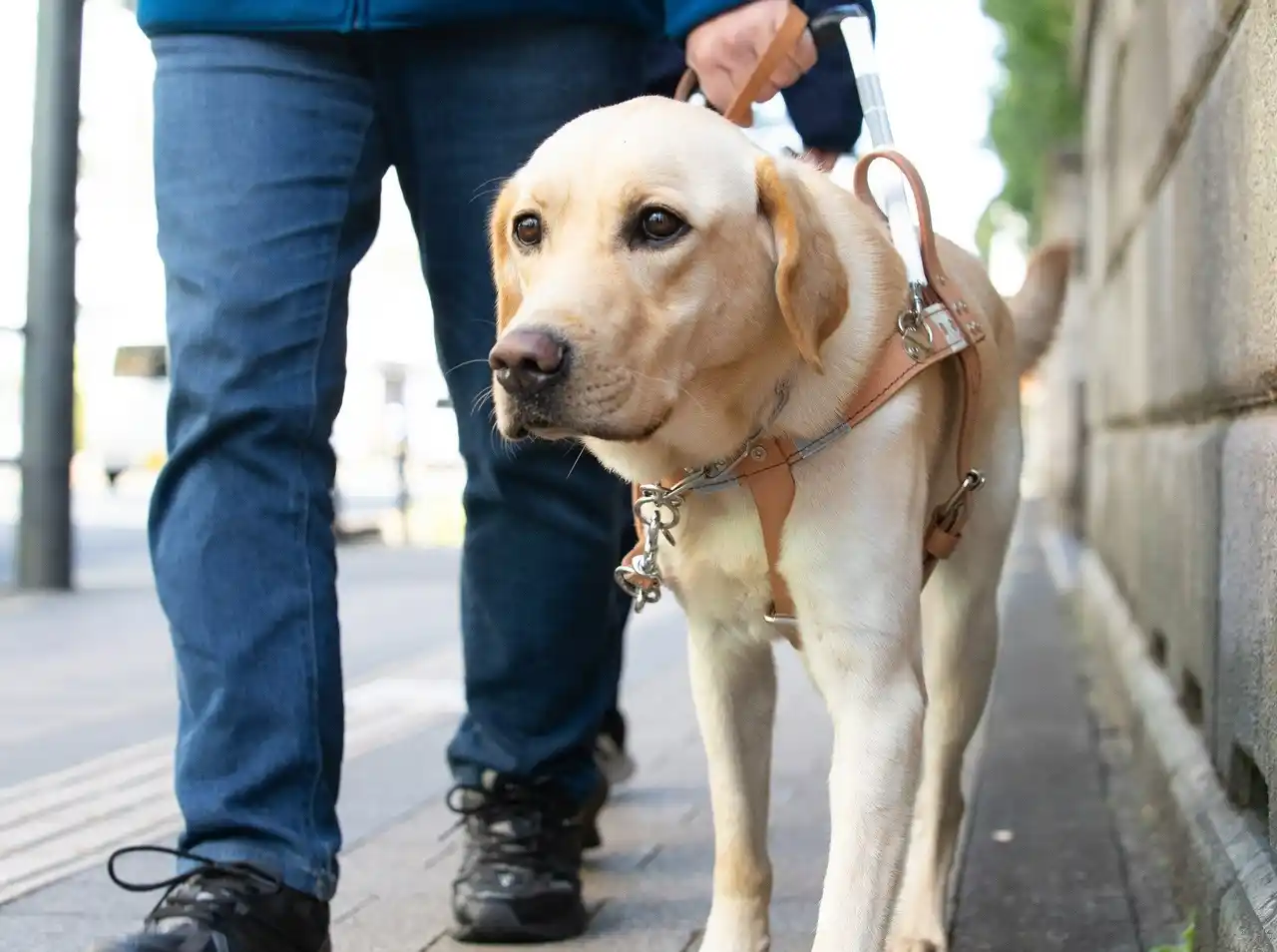 歩行指導員と街中で訓練をするアイメイト候補犬 |