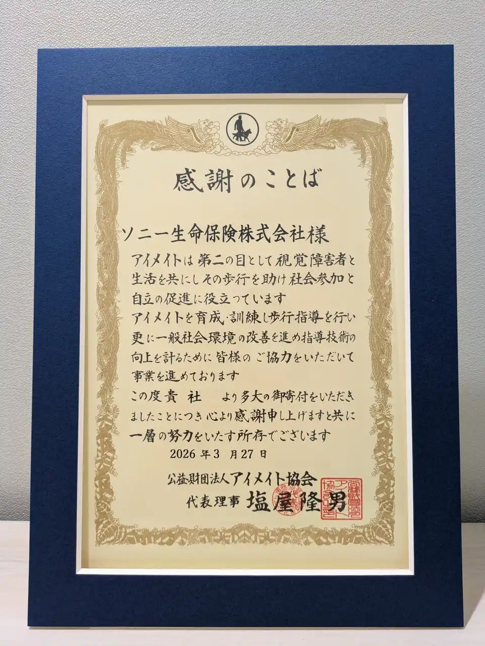 ソニー生命保険株式会社(代表取締役社長:坪田 博行、以下「当社」)は「アイメイト(盲導犬)育成による視覚障がい者の社会参加の支援」を目的として、2026年3月27日に公益財団法人アイメイト協会(代表理事:塩屋 隆男、以下「アイメイト協会」)へ寄付金の贈呈を行いました。また、四半世紀以上にわたる継続的な支援に対し、アイメイト協会 塩屋 隆男代表理事より感謝状が授与されました。 |