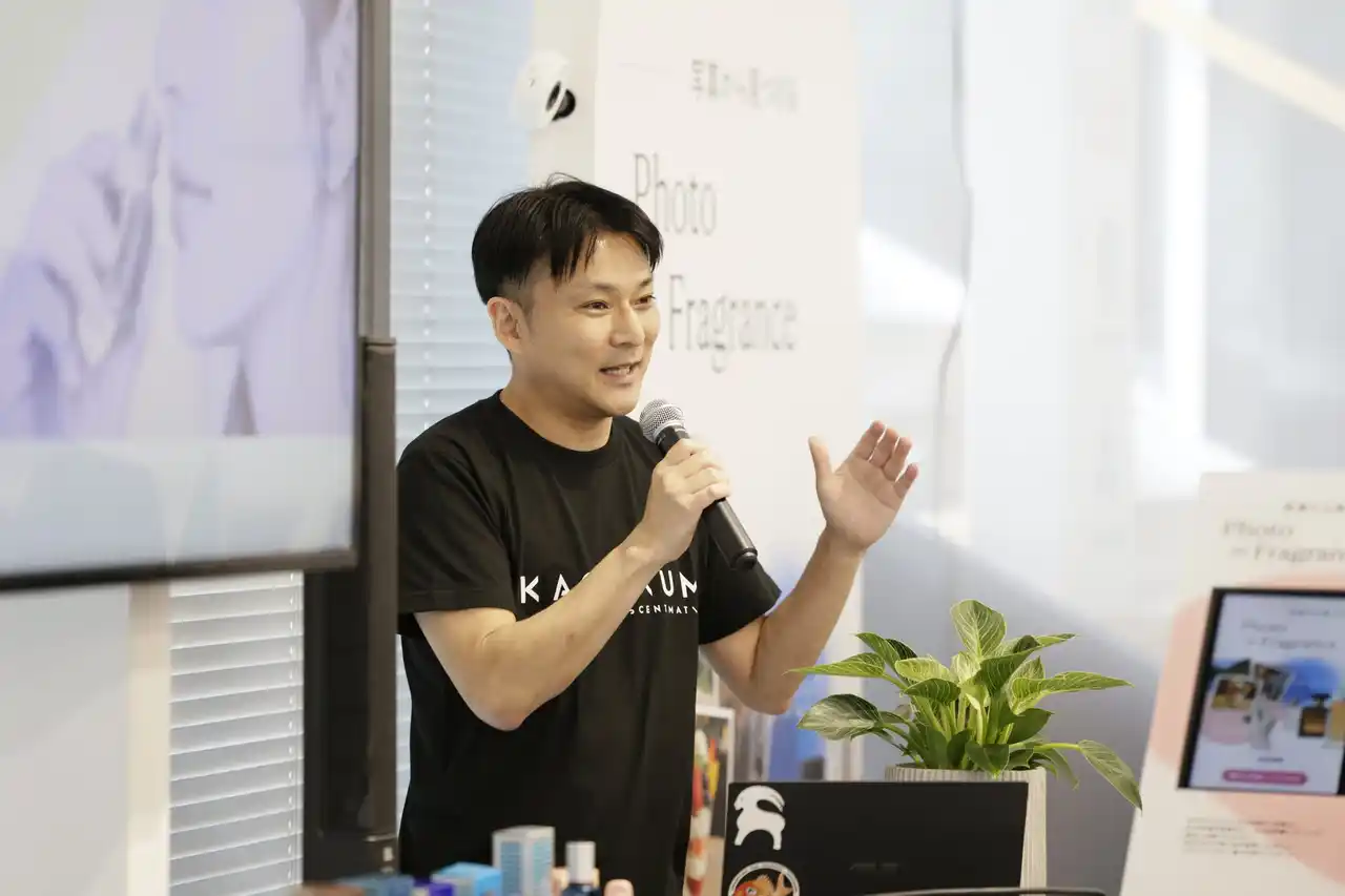 そのうえで栗栖は、同社が追求してきた価値観の核を、印象的なたとえで説明。「絵画を鑑賞するときは、曖昧な感覚の中で"なんとなくいいな"と楽しんでいる方が多い。そこに言葉が加わった体験が、実は漫画なんです。セリフがあることで、絵の持つ力がクリアに伝わってくる」と語り、同じことが音楽とその歌詞の関係にも当てはまると続けました。「言葉には、曖昧な感覚をよりクリアにし、さらに情動を強く増幅する力がある。同じことを、私たちは香りの領域で実現したいと考えてきました」と、セントマティックが6年間こだわり続けてきたコンセプトへの想いを力強く語りました。 |