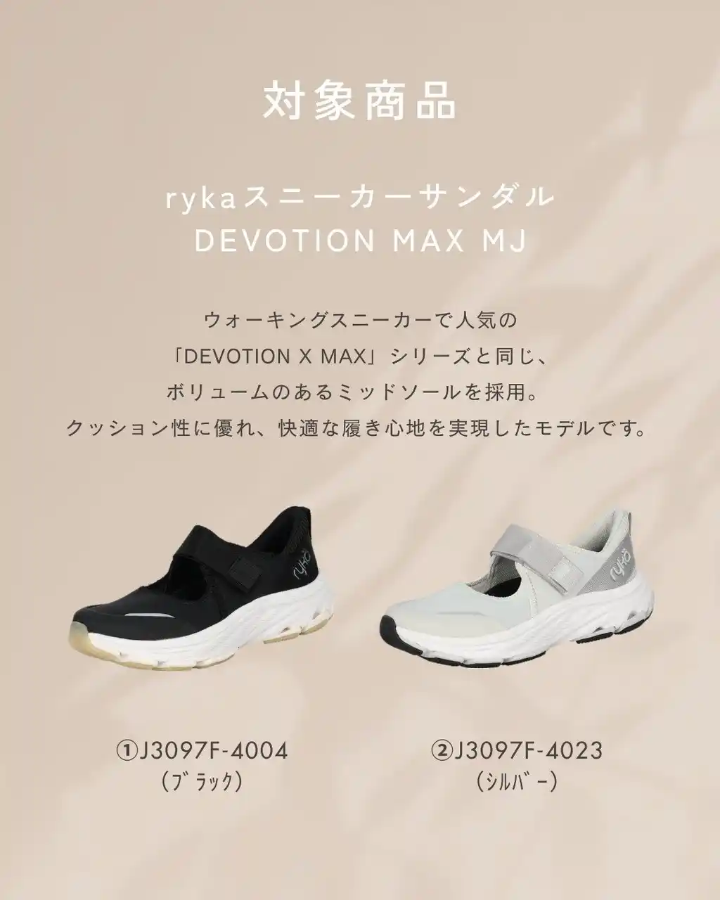 ryka公式インスタグラムアカウント(@ryka.jp)のフォロワー様限定企画で、ウォーキングスニーカーで人気の【DEVOTION X MAX】シリーズと同じボリュームのあるミッドソールを採用し、クッション性、快適な履き心地を実現したスニーカーサンダル【DEVOTION MAX MJ】を抽選で合計2名様にプレゼントいたします。 |