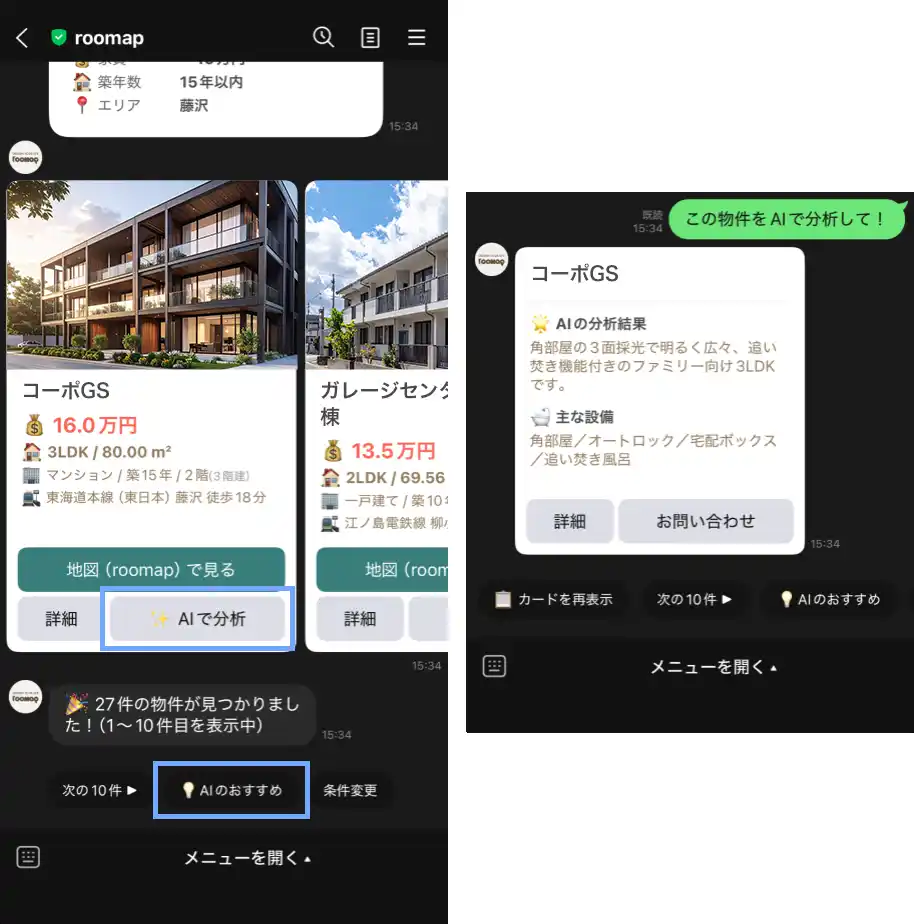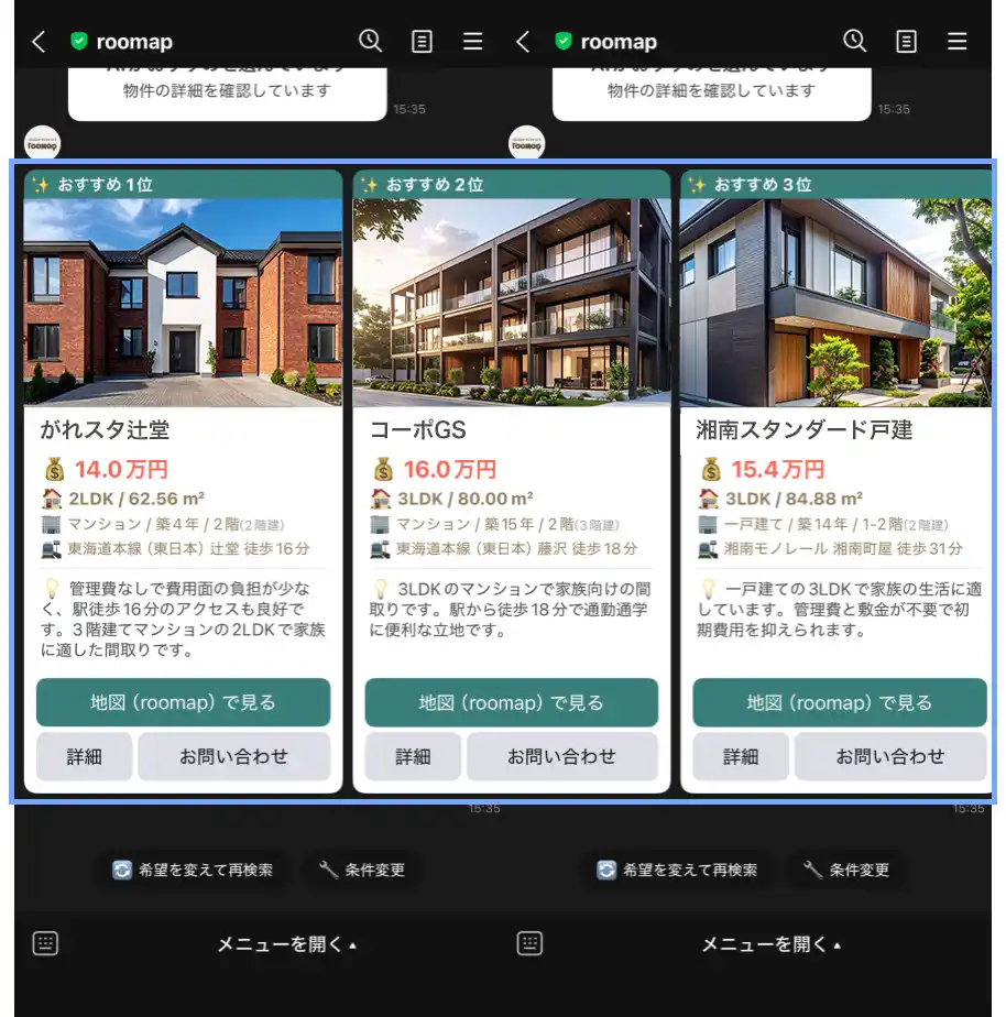 検索結果の中から、AIがユーザーの条件に合った物件を3件ピックアップ。物件ごとの特徴をコメント付きでわかりやすく提案します。 |