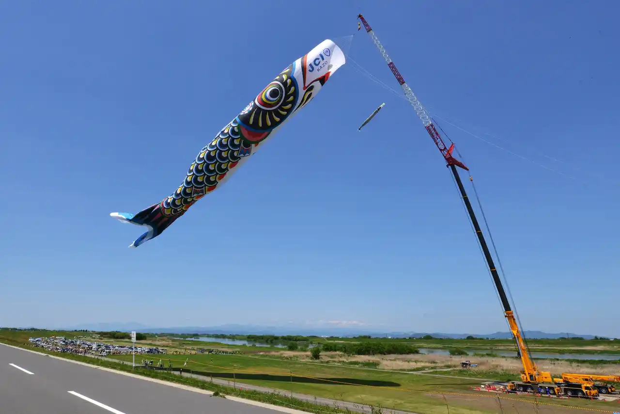 このジャンボこいのぼりを大空へ掲揚するには、大型クレーンが欠かせません! |