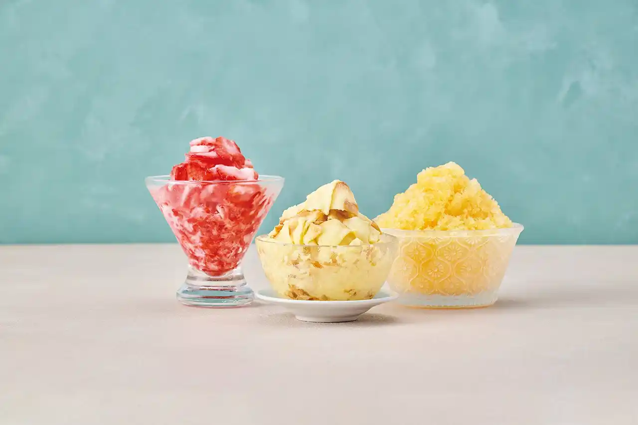 | 冷凍フルーツをそのまま削ることで、ヘルシーなデザートとしても◎左から、冷凍いちごかき氷、プリン凍り、オレンジジュース氷。オリジナルスイーツも簡単に作れます。 | |||