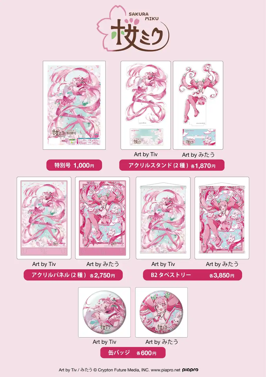 桜ミクアクリルスタンド(みたう Ver.) ¥1,870 桜ミクアクリルスタンド(Tiv Ver.) ¥1,870 桜ミク缶バッジ(みたう Ver.) ¥600 桜ミク缶バッジ(Tiv Ver.) ¥600 桜ミクB2タペストリー(みたう Ver.) ¥3,850 桜ミクB2タペストリー(Tiv Ver.) ¥3,850 桜ミクアクリルパネル(みたう Ver.) ¥2,750 桜ミクアクリルパネル(Tiv Ver.) ¥2,750 2026年桜ミク特別号 ¥1,000 |