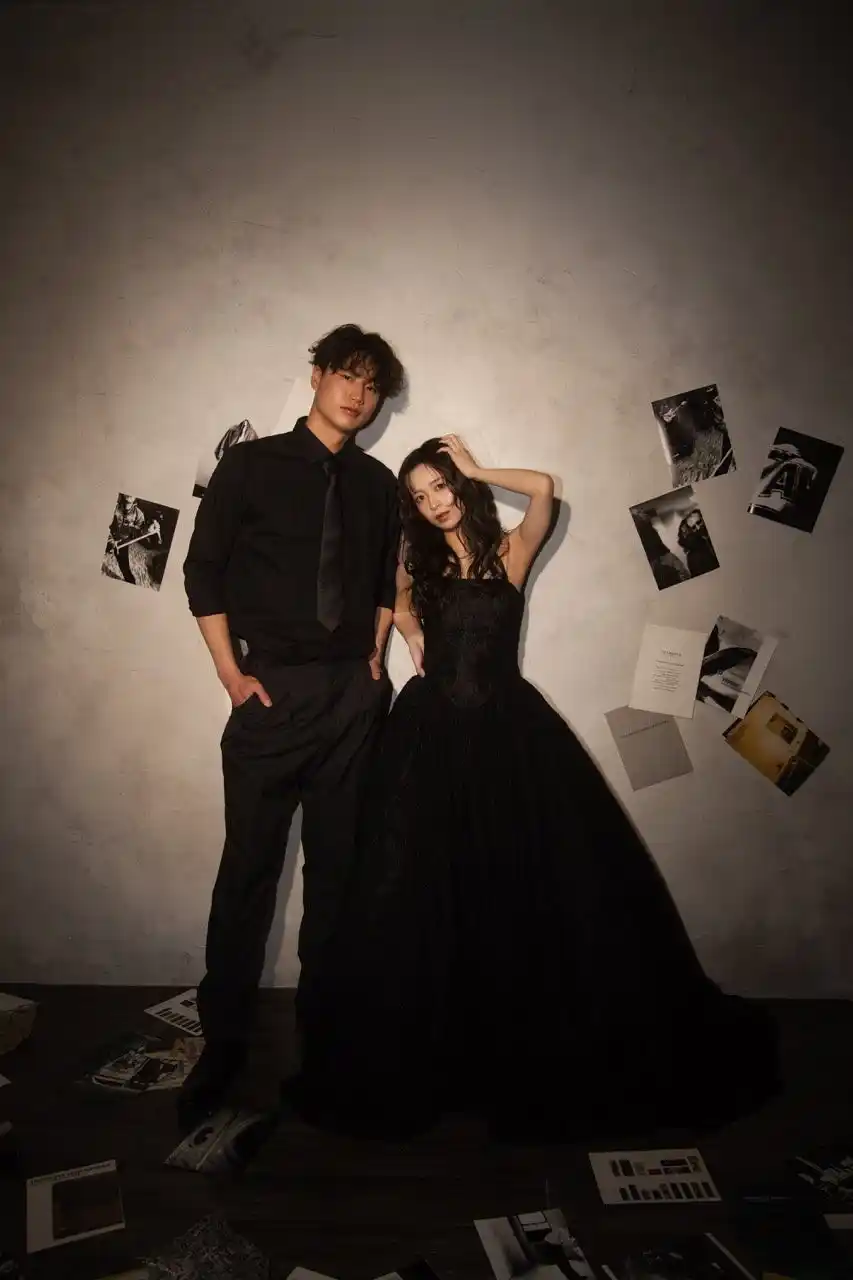 「NOIR BRIDE」は、黒という色が持つ静謐さと強さにフォーカスしたビジュアルです。 華やかさだけではなく、内面の芯の強さや個性を引き出すことで、花嫁の新たな魅力を表現しています。 無機質なグレー壁のスタジオ空間に、ランダムに配置された写真や紙片。 そこに佇む花嫁と新郎は、まるでひとつのアートピースのように構成され、シンプルでありながらも強い余白とストーリー性を感じさせます。 |