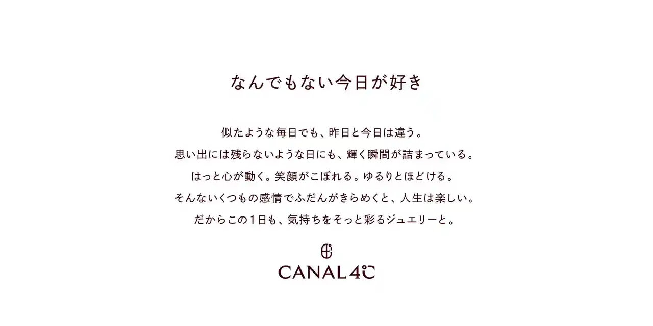 CANAL 4℃が掲げる新たなブランドメッセージは、「なんでもない今日が好き」。特別な日のためだけではなく、日常のワンアクションにそっと彩りを添えるジュエリーを通じて、毎日の中にある小さなきらめきや、自分らしく過ごす時間に寄り添うブランドへと進化します。 |