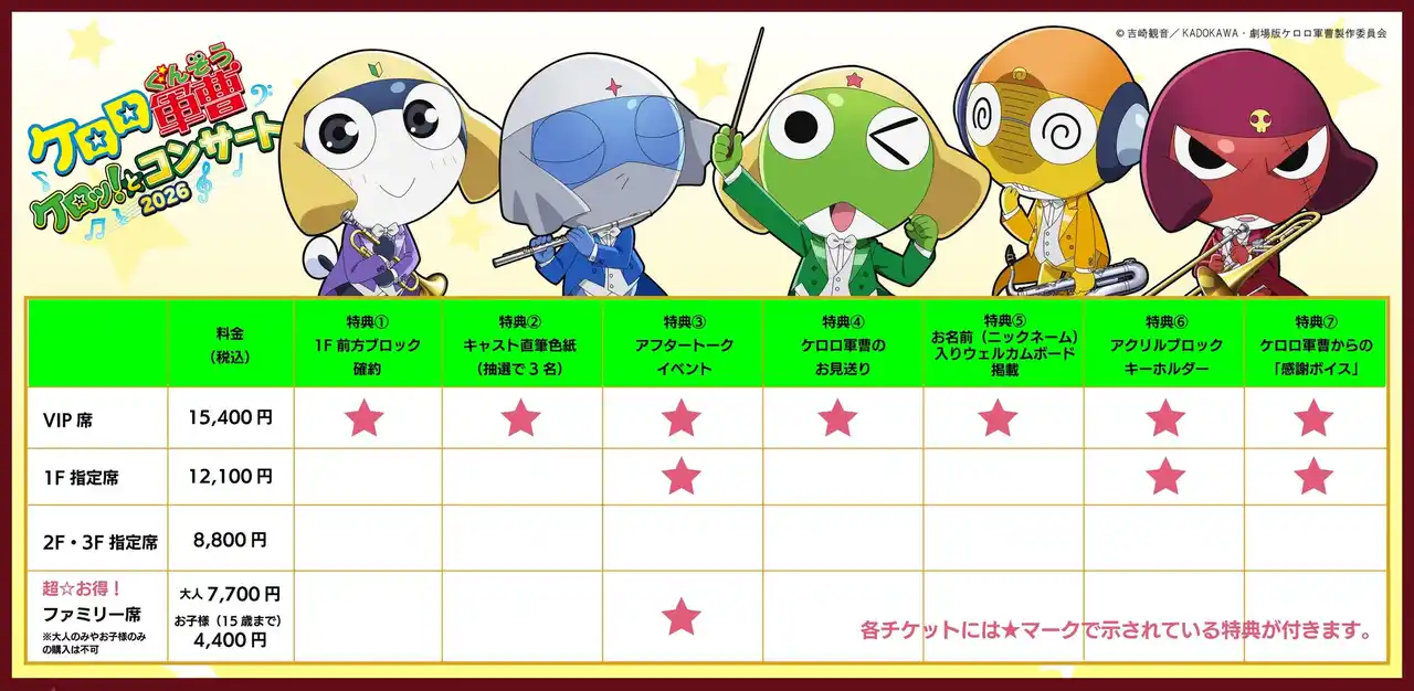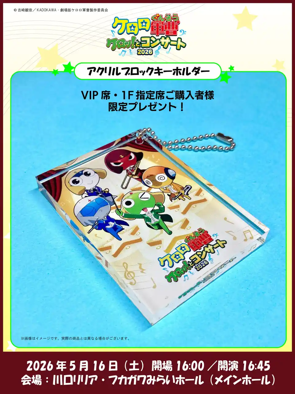 1.1F前方ブロック確約:生演奏とキャストの熱演を目の前で体感できる、大迫力のフロントシート 2.キャスト直筆色紙(抽選):VIP席購入者の中から抽選で3名様にプレゼント! 3.アフタートークイベント:終演後開催される限定トークショー(約20~30分)への参加権 4.ケロロ軍曹のお見送り:アフタートークイベント終了後、ケロロ軍曹がみなさんをお見送り! 5.お名前(ニックネーム)入りウェルカムボード掲載:会場に設置されるボードに、あなたの隊員名(ニックネーム)を掲出 6.アクリルブロックキーホルダープレゼント:描き下ろしイラストを使用したここでしか手に入らないグッズをプレゼント 7.ケロロ軍曹からの「感謝ボイス」:ケロロ軍曹からの録り下ろしサンクスボイスが聴けるDLコードを配布 |