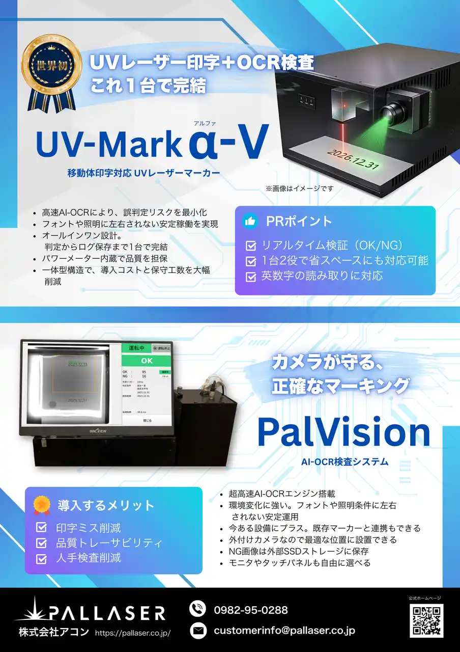 本製品は、UVレーザー印字とOCR検査を1台に統合することで、印字ミスや検査漏れといった現場課題を解決。生産ラインの効率化と品質リスク低減に貢献します。 |