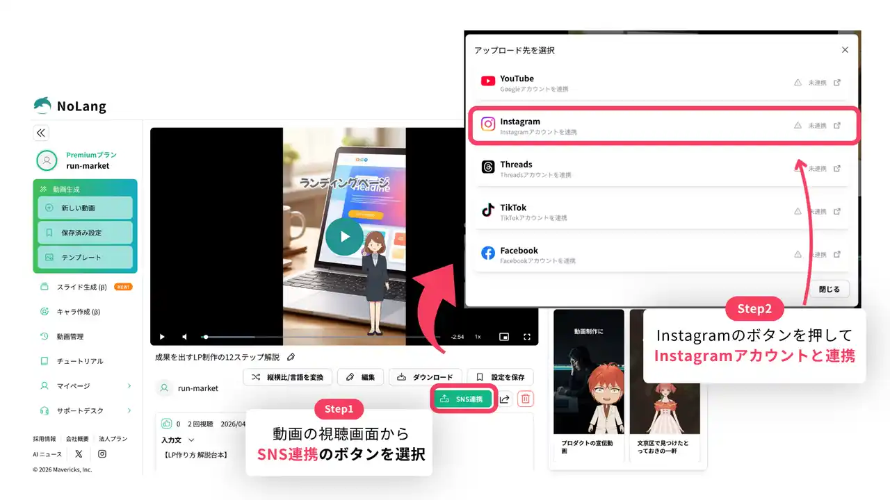 日本発・国内最大級(※)の動画生成AIサービス「NoLang(ノーラン)」を提供する株式会社Mavericks(本社:東京都文京区、代表取締役社長:奥野 将太)は、NoLangで生成した動画をInstagramへ直接投稿できる「Instagram連携機能」の提供を開始しました。 |