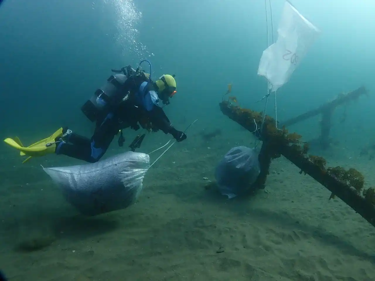 回収作業は、2025年6月から11月にかけて実施しました。3名のダイバーが潜水し、ゴミの状況を確認したうえで、手作業で回収しました。また、大型のゴミの回収については、羅臼漁業協同組合の指導船の協力により行いました。さらに、北海道内外からダイビングツアーに参加されたお客様(計8名)にも、回収作業を手伝っていただきました。 |