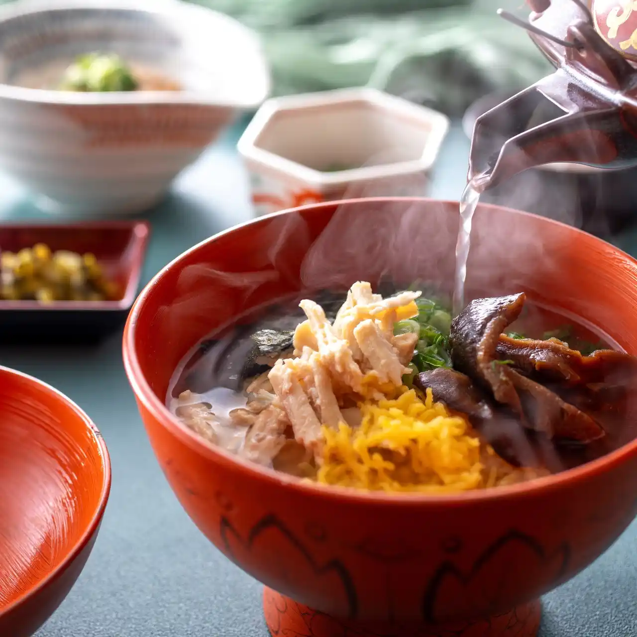 熱々のスープを注いで楽しむ奄美大島ゆかりの鶏飯 |