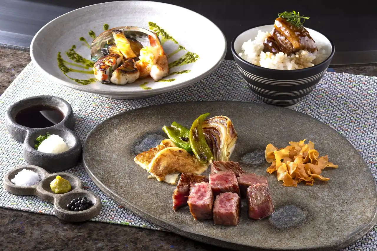 厳しい基準を満たした鹿児島黒牛“黒乙女5 5”のロース、または鹿児島県産黒毛和牛フィレをメインに選べる鉄板焼コース。前菜の鮑や海老、特製さつま揚げのソテーは、コクのある鹿児島県産醤油のバターソースで。黒乙女5 5 のステーキは、雌牛ならではのきめ細やかな肉質と軽やかな脂が魅力。締めは、鹿児島の醤油や黒糖、焼酎でじっくり煮た黒豚角煮丼をどうぞ。 |