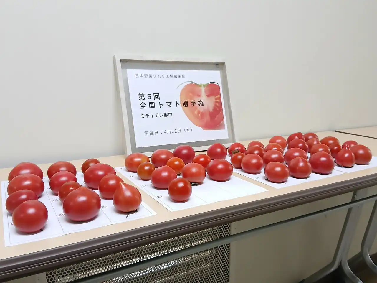 一般社団法人 日本野菜ソムリエ協会(東京都渋谷区、代表理事:福井栄治、以下当協会)は、2026年4月22日(水)に、農産物のさらなる価値向上を目指す青果物の品評会イベントとして「第5回全国トマト(ミディアム)選手権」(以下、本選手権)を開催しました。全国から集まったおいしさ自慢のミディアムトマト全45品の中から、評価員である野菜ソムリエが産地や品種、生産者などの情報をすべて伏せて食味。そのおいしさを審査し、もっともおいしい「トマト」を決定しました。全国青果物選手権では初めて、高校生が育てたトマトが最高金賞を受賞!非常にレベルの高い品評会となりました。 |