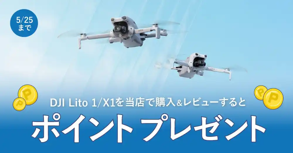 対象期間中にシステムファイブでDJI Lito 1 / Lito X1を購入し、商品を実際にお使いいただいた感想を条件に沿ってレビューを投稿していただくと、採用時に次回のお買い物でご利用可能なポイントを最大3,000円分(3,000ポイント)プレゼントいたします。 |