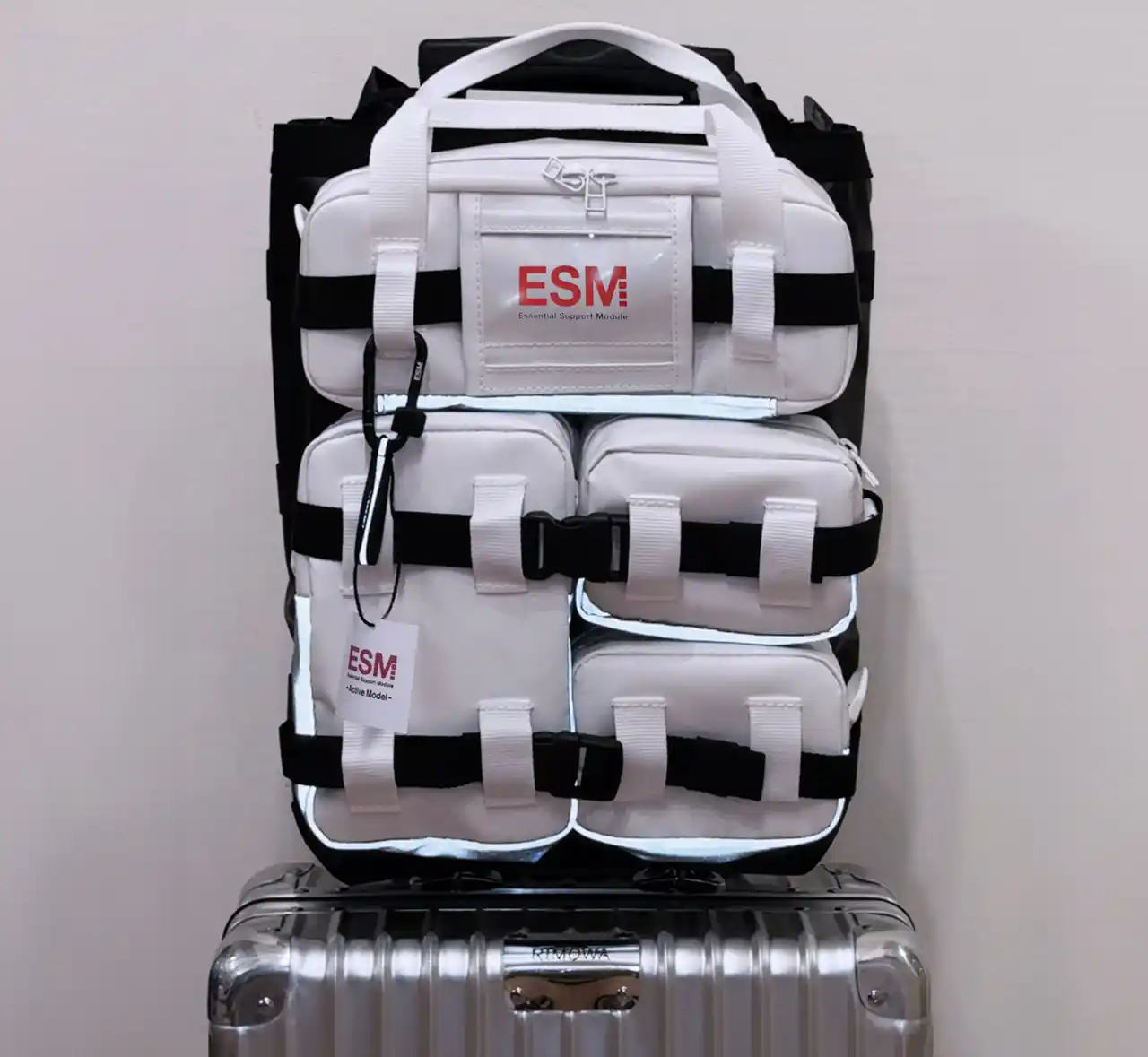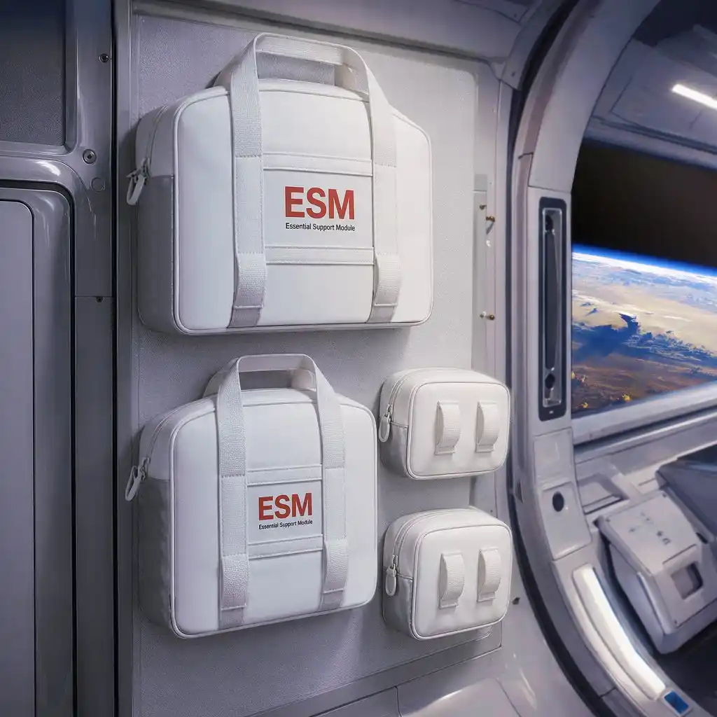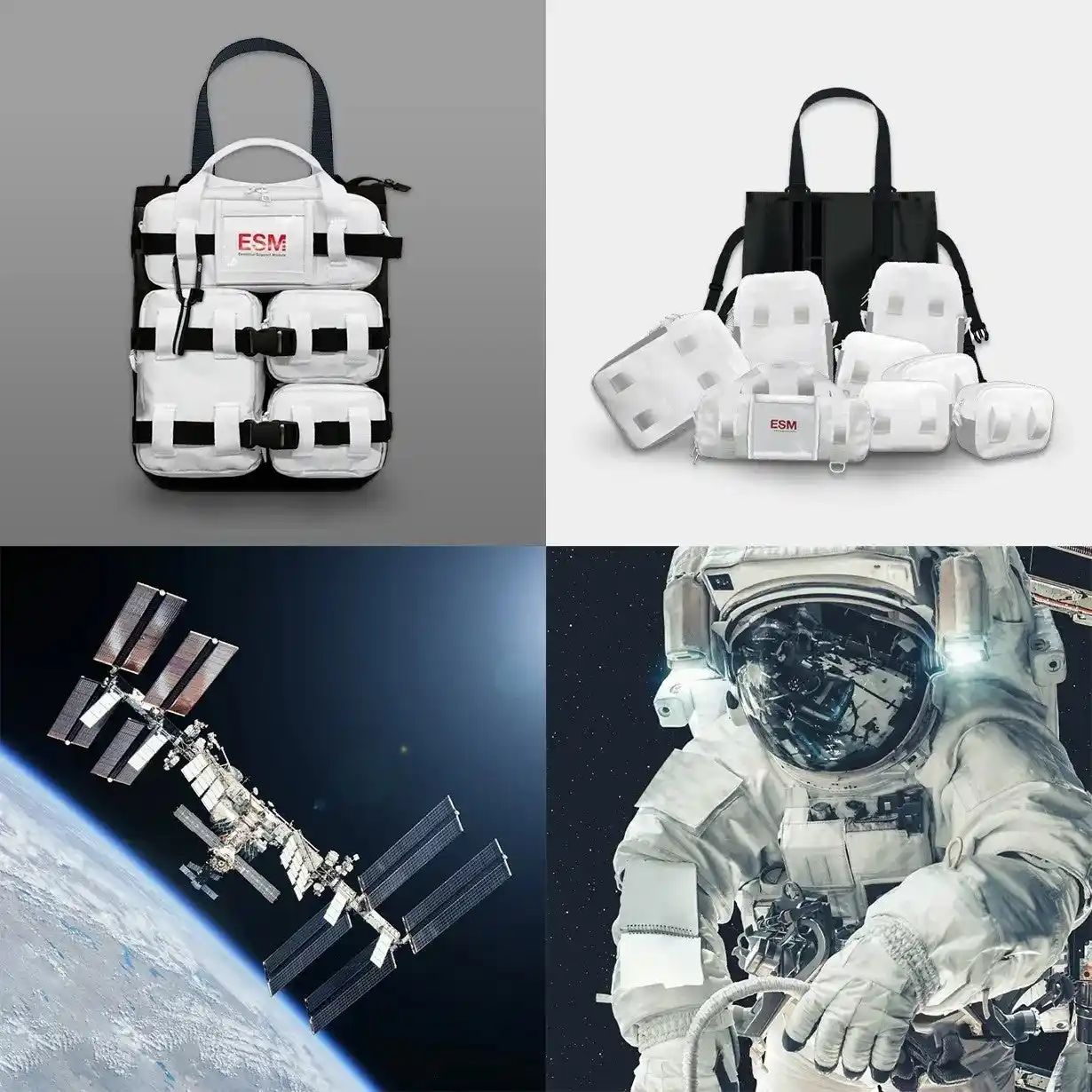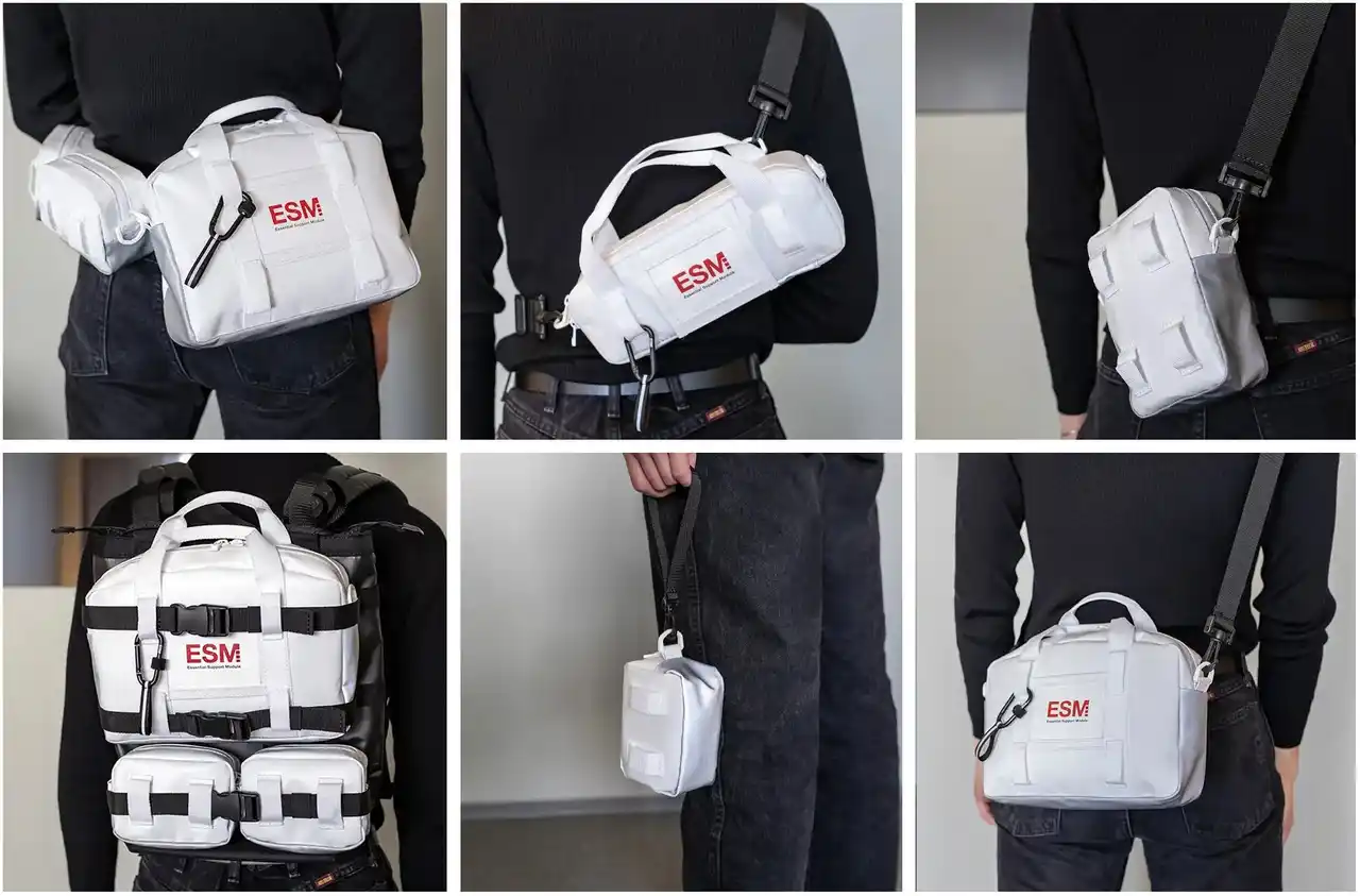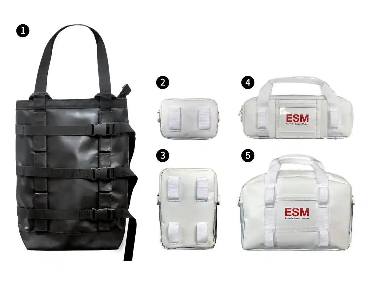 国際宇宙ステーションのモジュール構造と宇宙服の生命維持装置に着想を得て開発された「ESM(Essential Support Module)」は、2023年に米DuPont社主催の「DuPont Tyvek Design Award 2023」で特別賞を受賞した「多構造型・着脱式モジュールバッグ」です。 宇宙でも、地上でも活用できるというコンセプトのもとデザインされた本バッグでは、宇宙ステーションなどの微小重力環境下で、身の回り品が浮遊しないよう面ファスナーで壁に固定する仕組みに着想を得て、ESMのモジュール裏面に面ファスナーを採用しました。宇宙空間を想定した仕様として、モジュールを壁に貼り付けて、クローゼットのように活用できるシステムバッグとなっています。 (※現行の生地素材や付属品は宇宙空間非対応) |